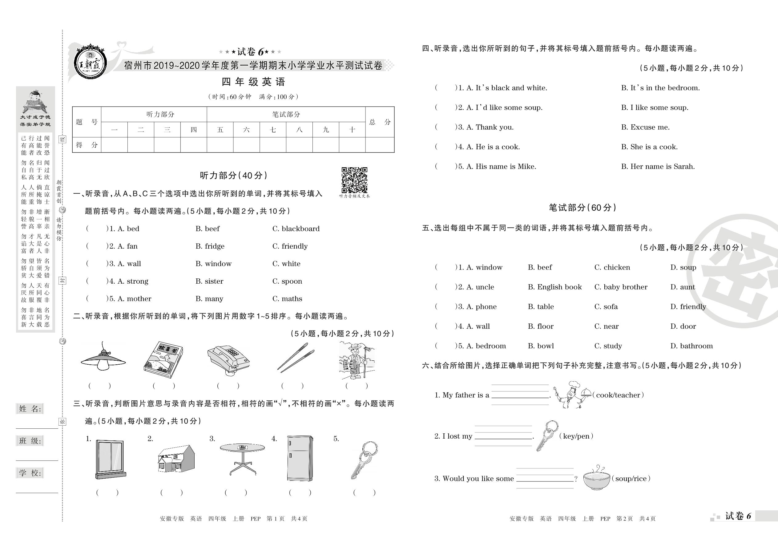 2019-2020学年第一学期宿州市四年级英语试卷(PEP版)【6】