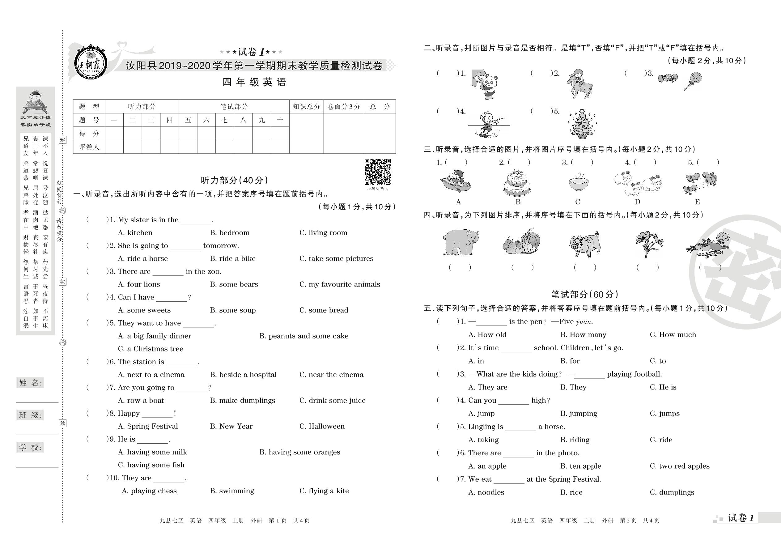 2019-2020学年第一学期洛阳市汝阳县四年级英语试卷(外研版)【1】
