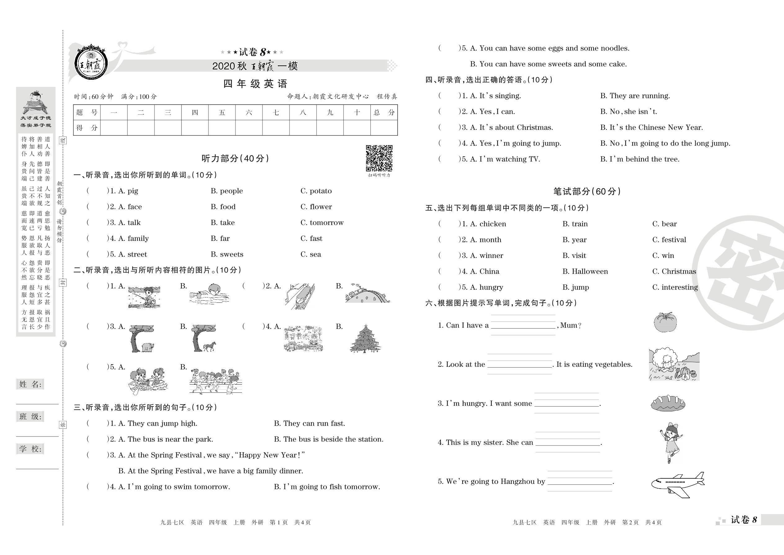 王朝霞期末模拟卷四年级上册英语(外研版)【8】