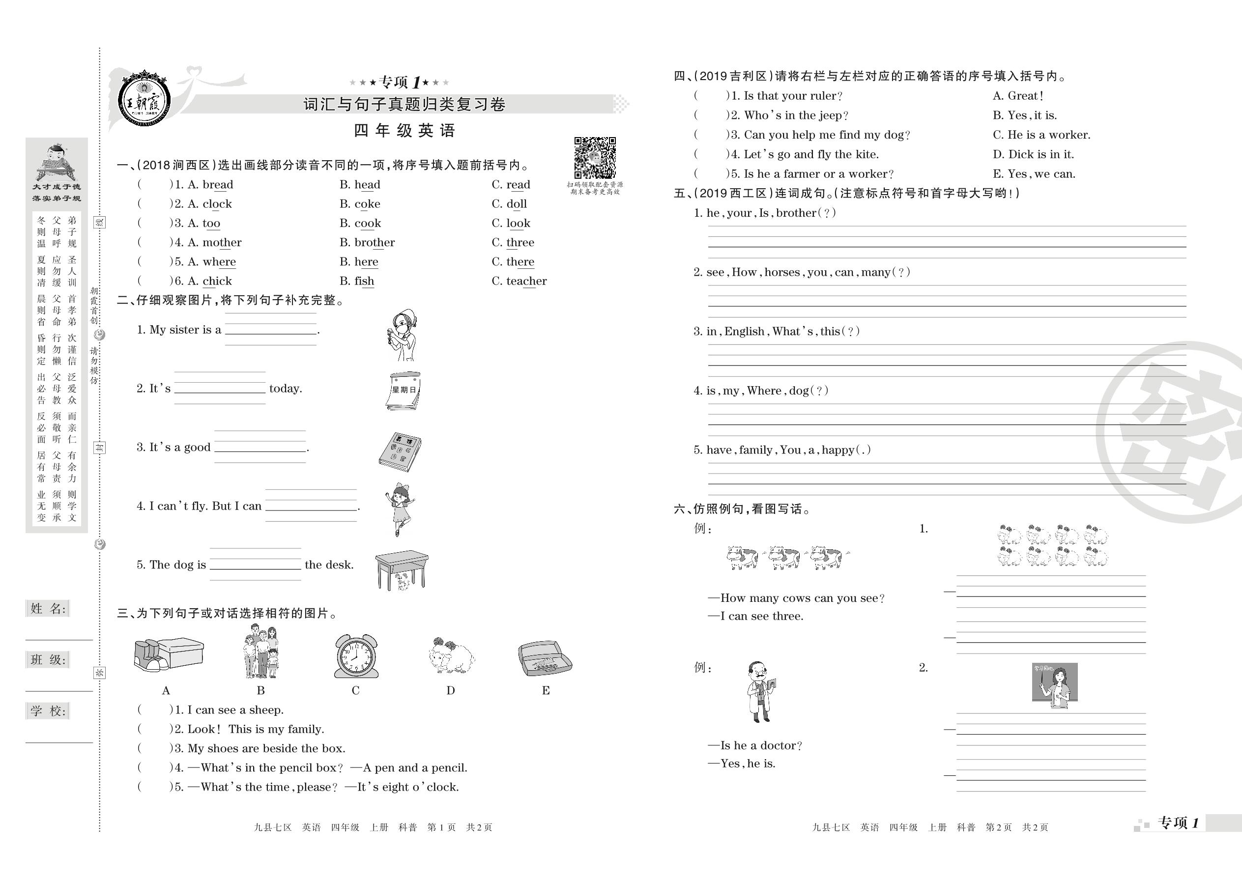 王朝霞期末专项卷——词汇与句子、补全短文与情景交际真题归类复习四年级上册英语(科普版)【0】