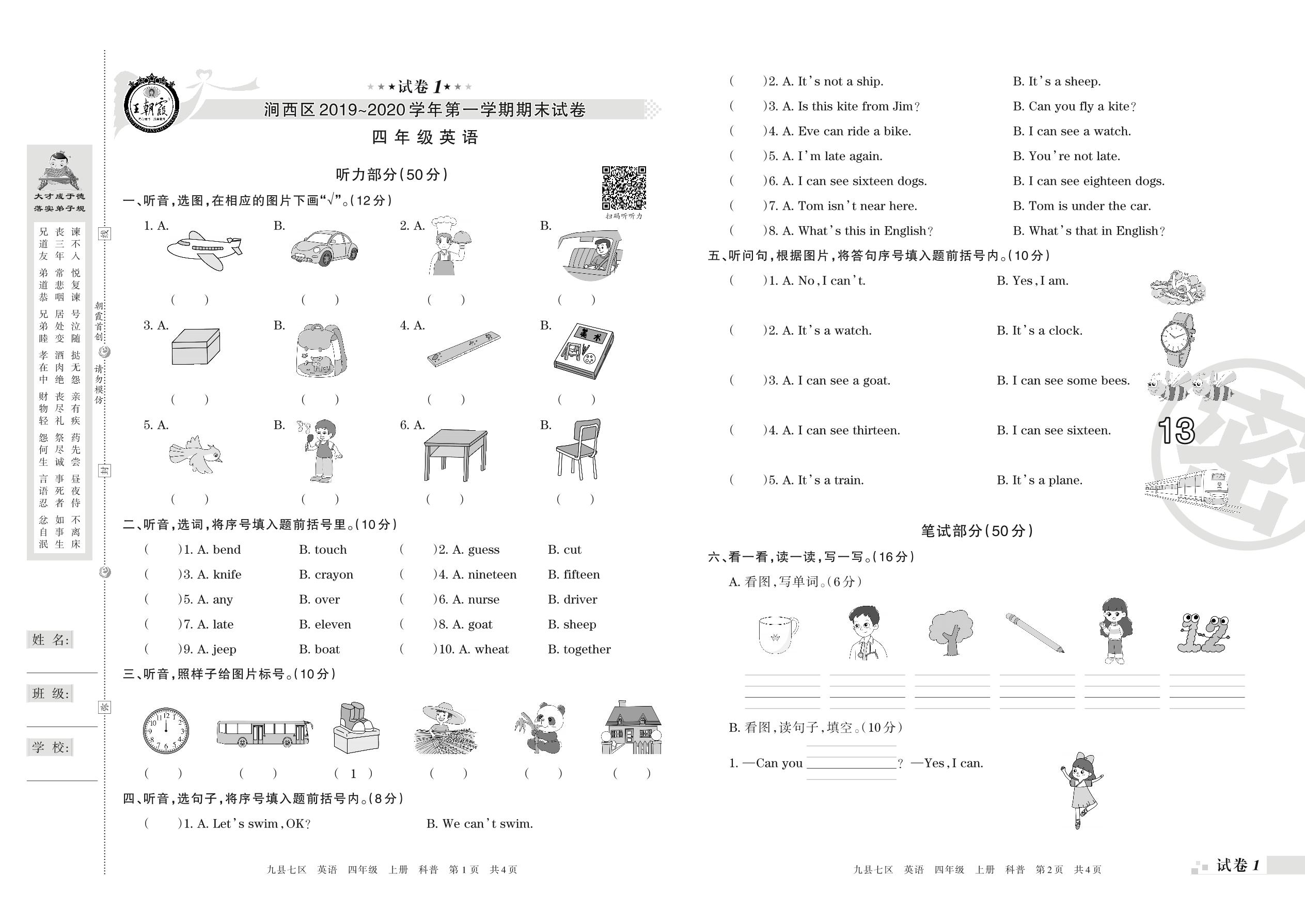 2019-2020学年第一学期洛阳市涧西区四年级英语试卷(科普版)_R21080790830【1】