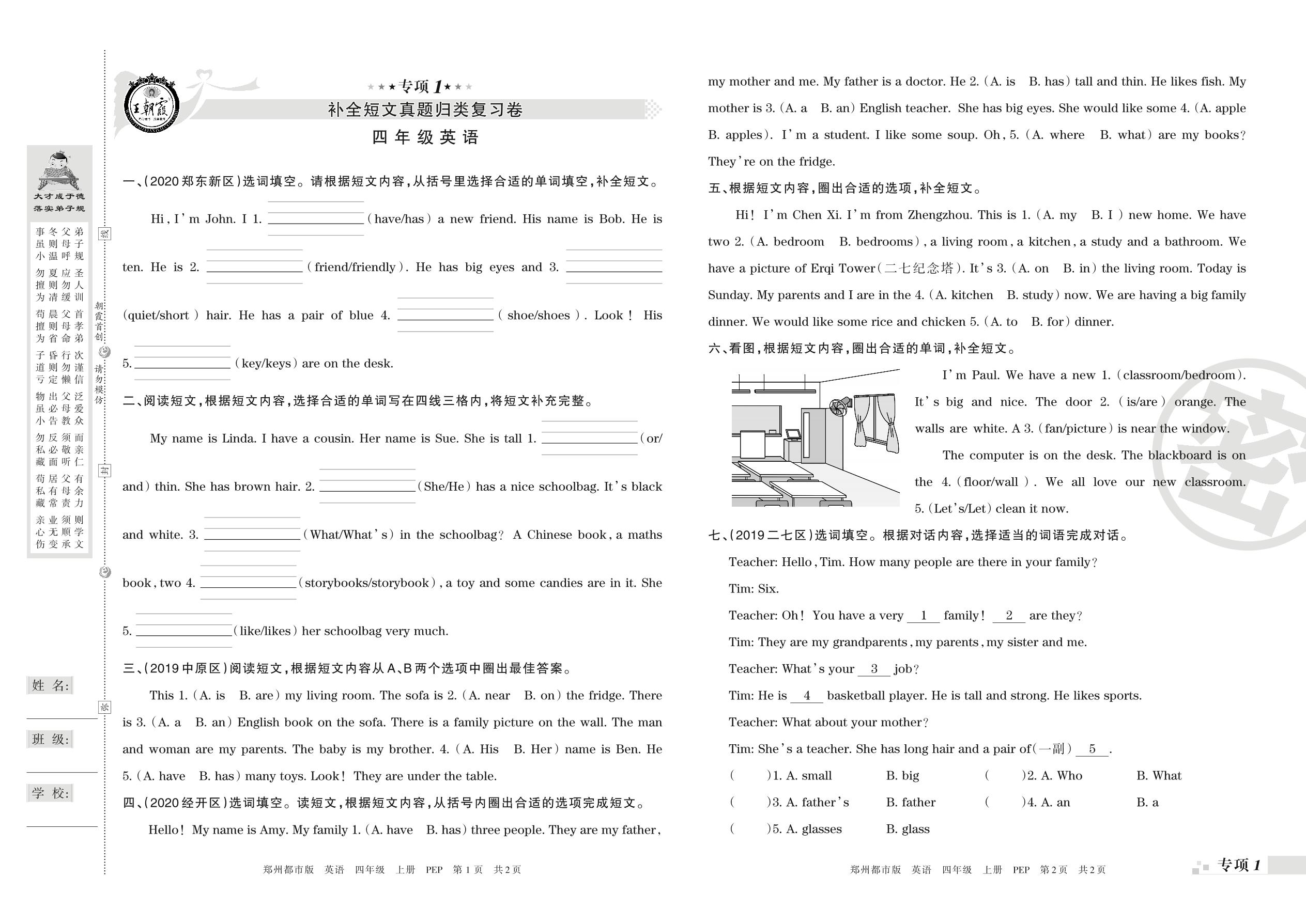 王朝霞期末专项卷——补全短文、阅读理解真题归类复习四年级上册英语(PEP版)_R21080790937【0】