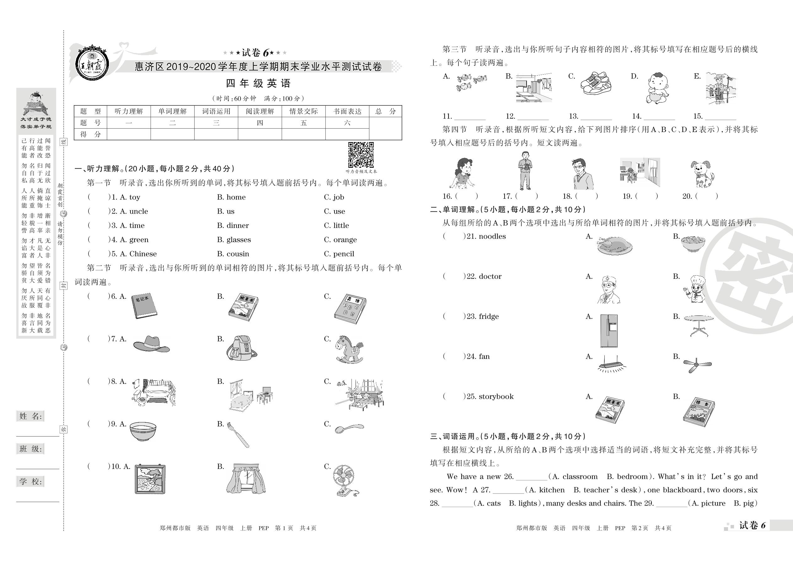 2019-2020学年第一学期郑州市惠济区四年级英语试卷(PEP版)【6】