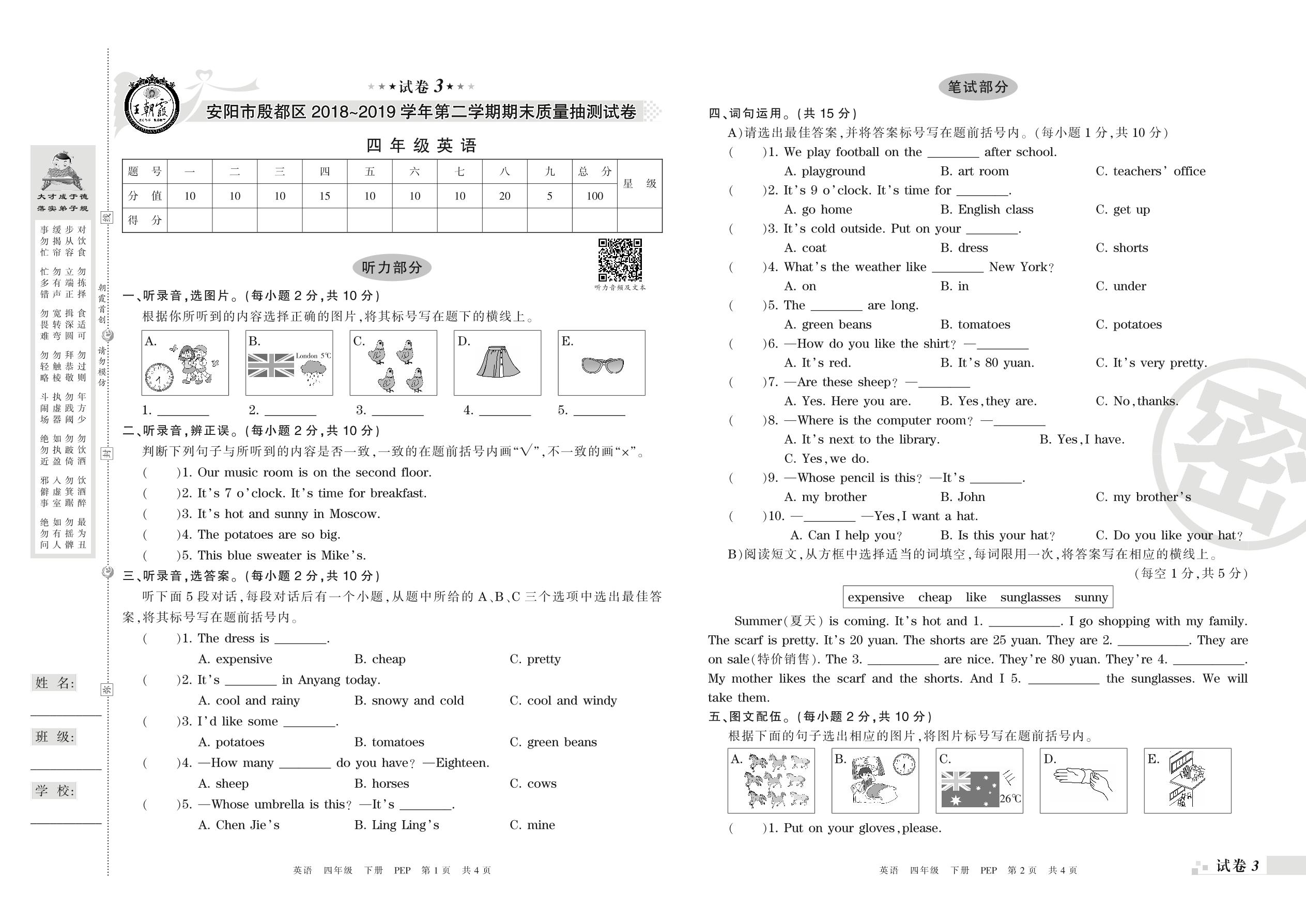 2018-2019学年第二学期安阳市殷都区四年级英语试卷(PEP版)【3】