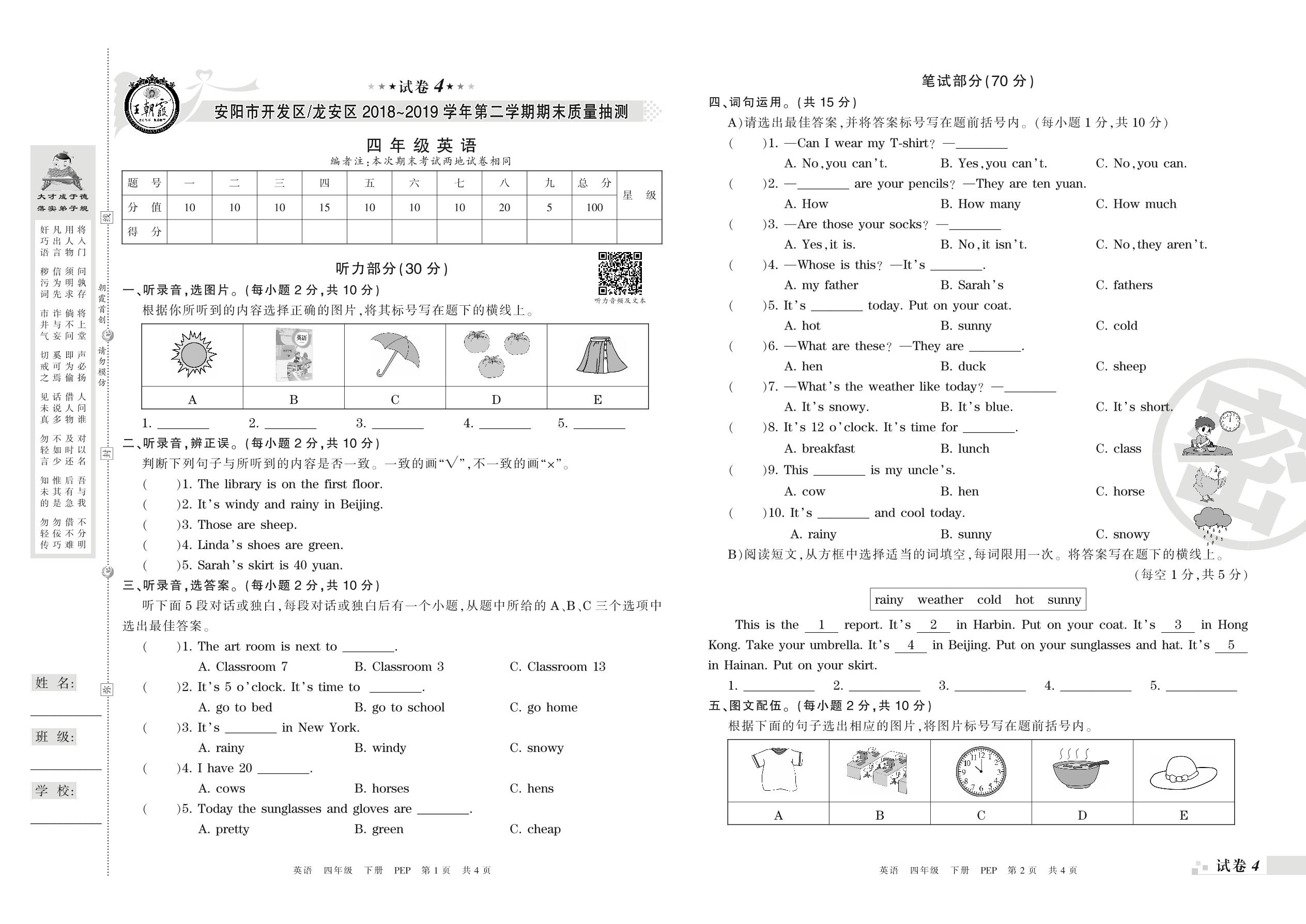 2018-2019学年第二学期安阳市开发区、龙安区四年级英语试卷(PEP版)【4】