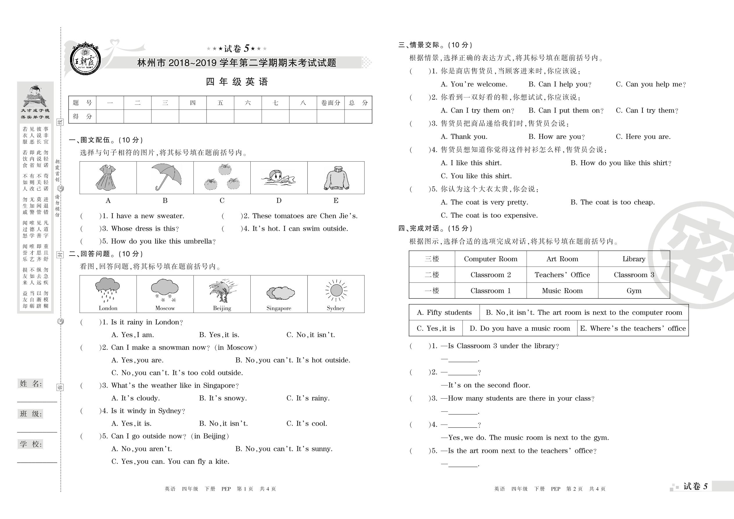 2018-2019学年第二学期林州市四年级英语试卷(PEP版)【5】