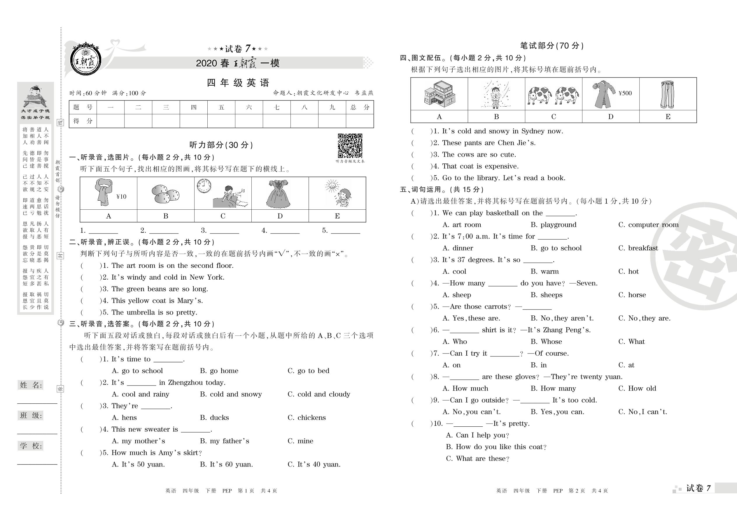 王朝霞期末模拟卷四年级下册英语(PEP版)_R21080791311【7】