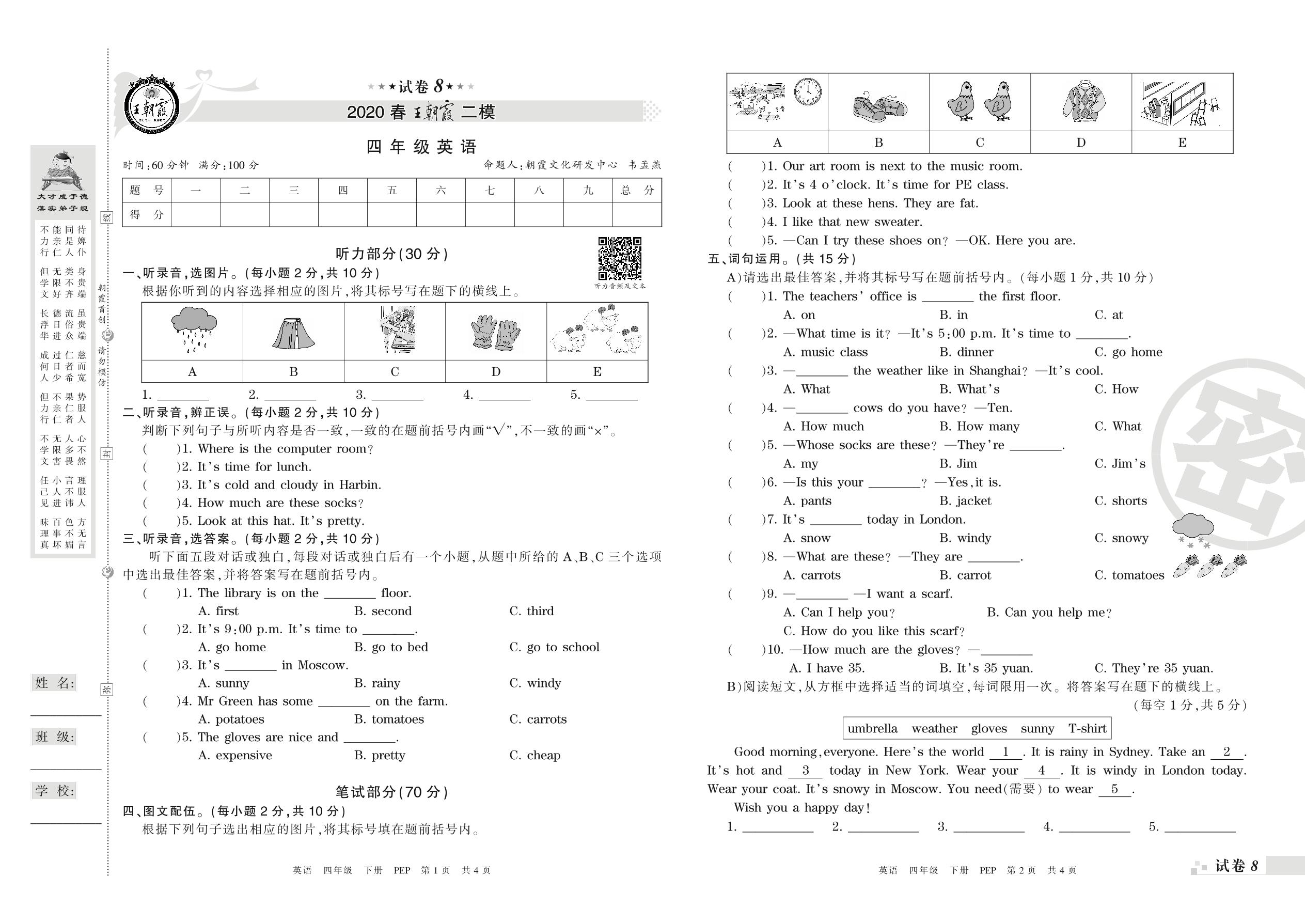 王朝霞期末模拟卷四年级下册英语(PEP版)_R21080791315【8】