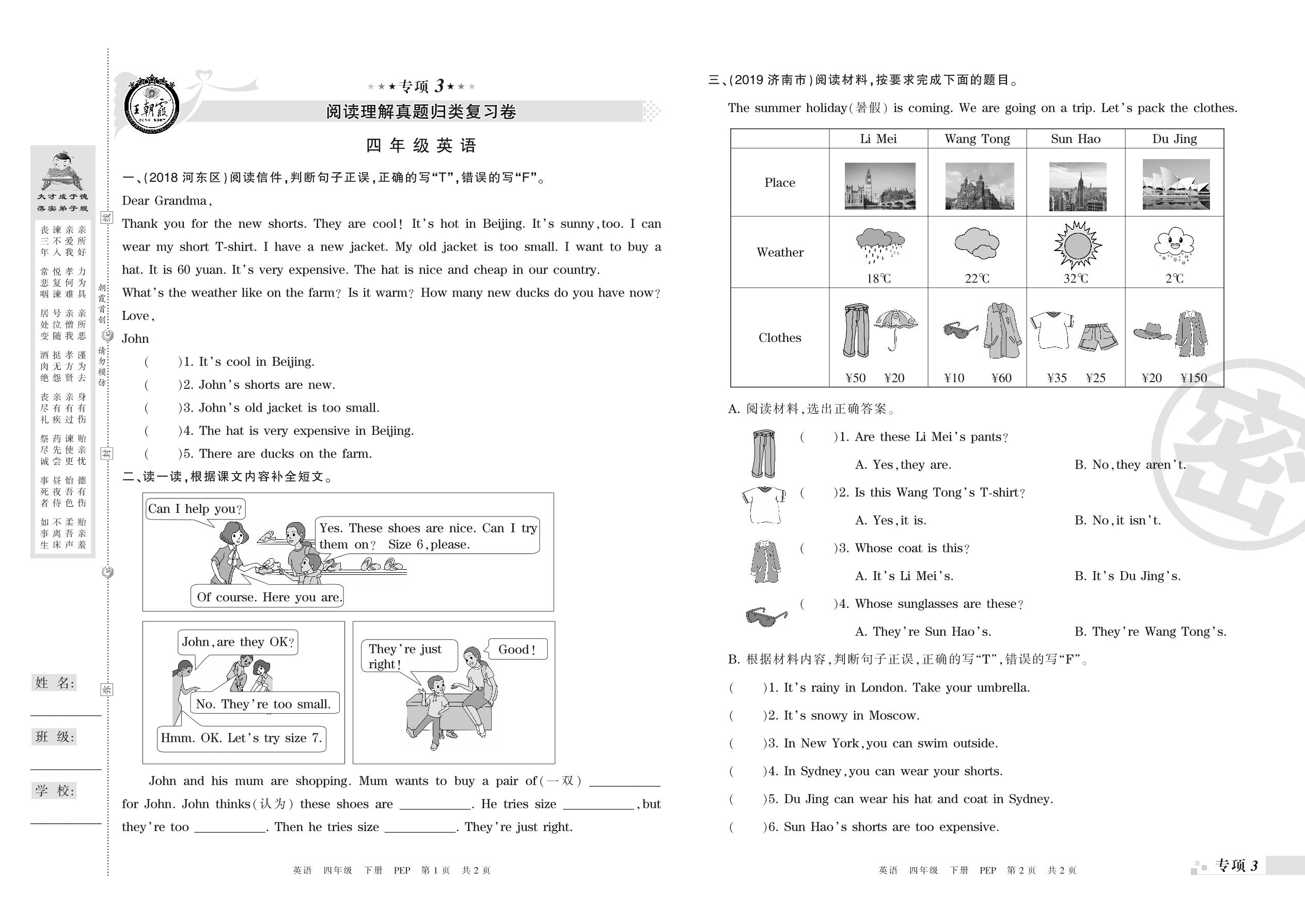 王朝霞期末专项卷——阅读理解真题归类复习卷、新颖题速递:绘本阅读四年级下册英语(PEP版)_R21080791340【0】