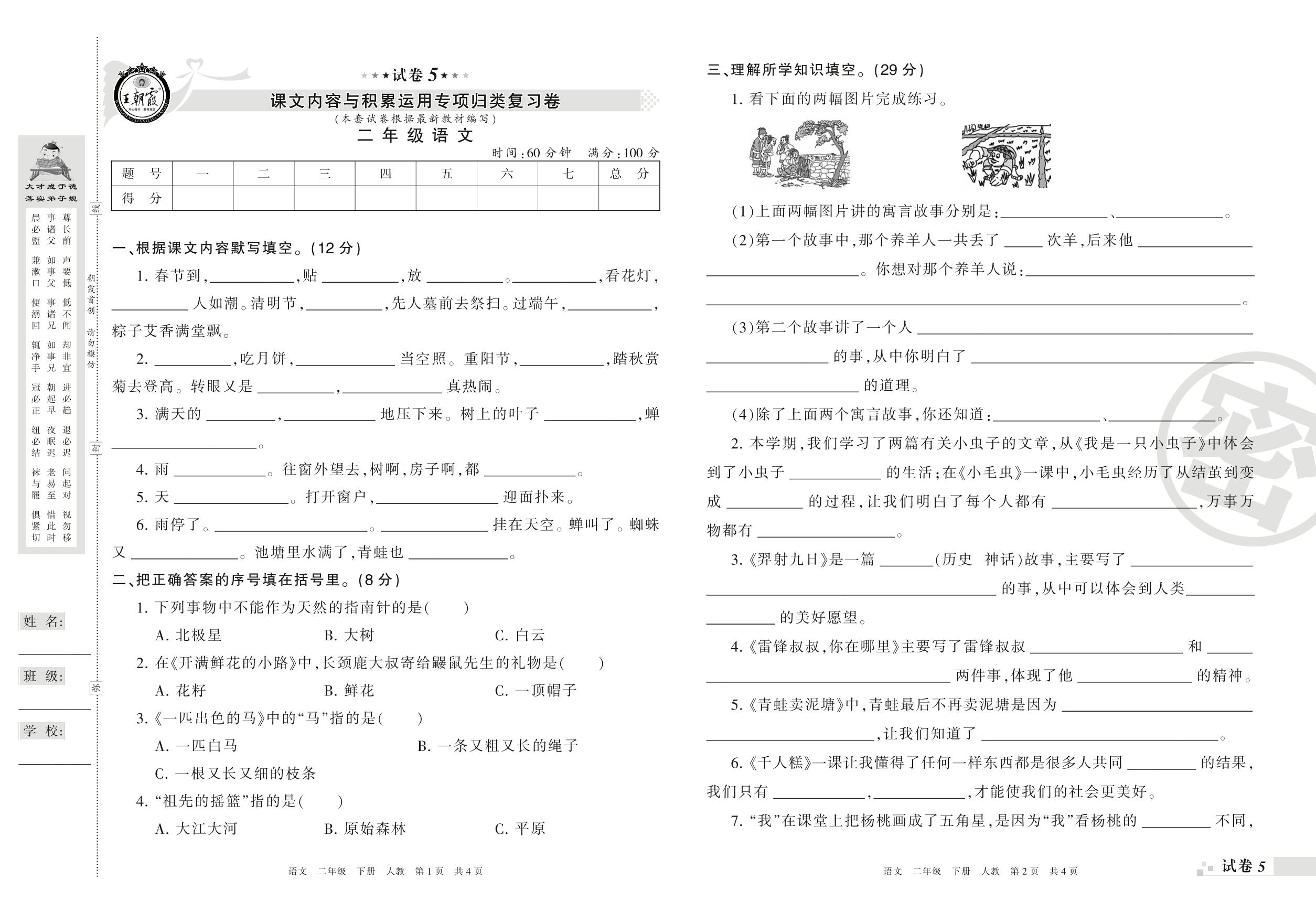 王朝霞期末专项卷——课文内容与积累运用专项归类复习卷二年级下册语文(人教版)_R21080181159【5】