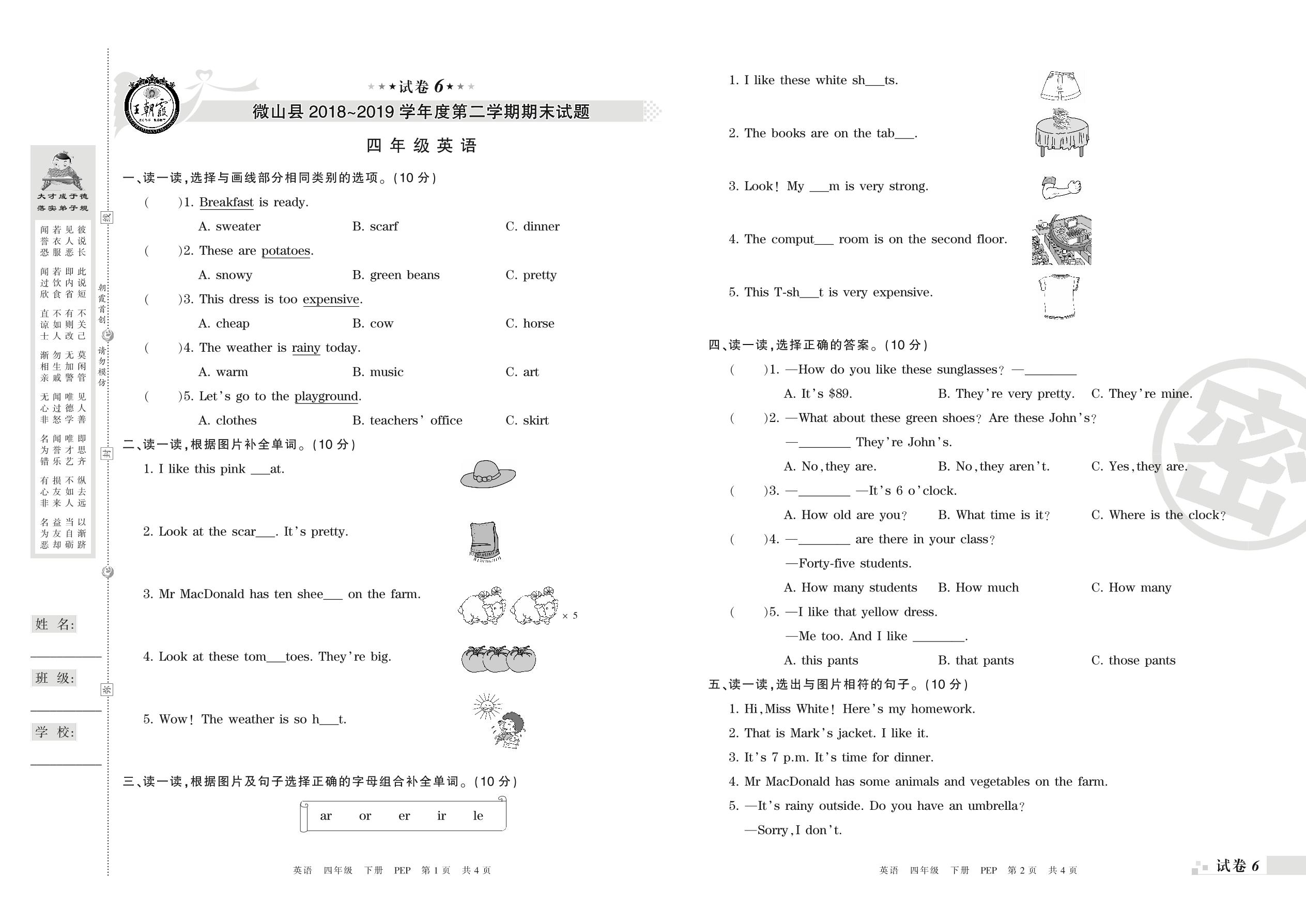 2018-2019学年第二学期济宁市微山县四年级英语试卷(PEP版)【6】