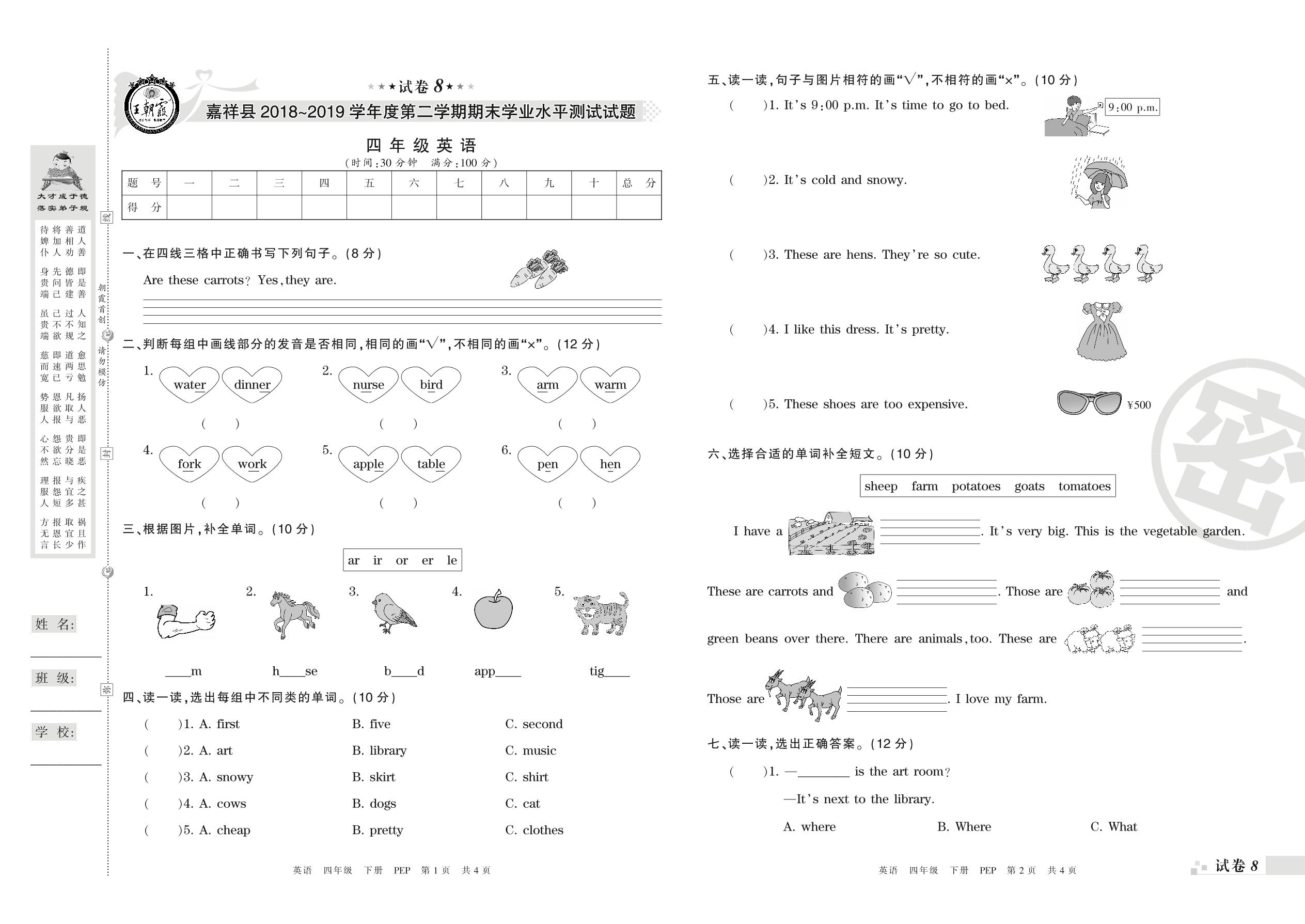 2018-2019学年第二学期济宁市嘉祥县四年级英语试卷(PEP版)【8】