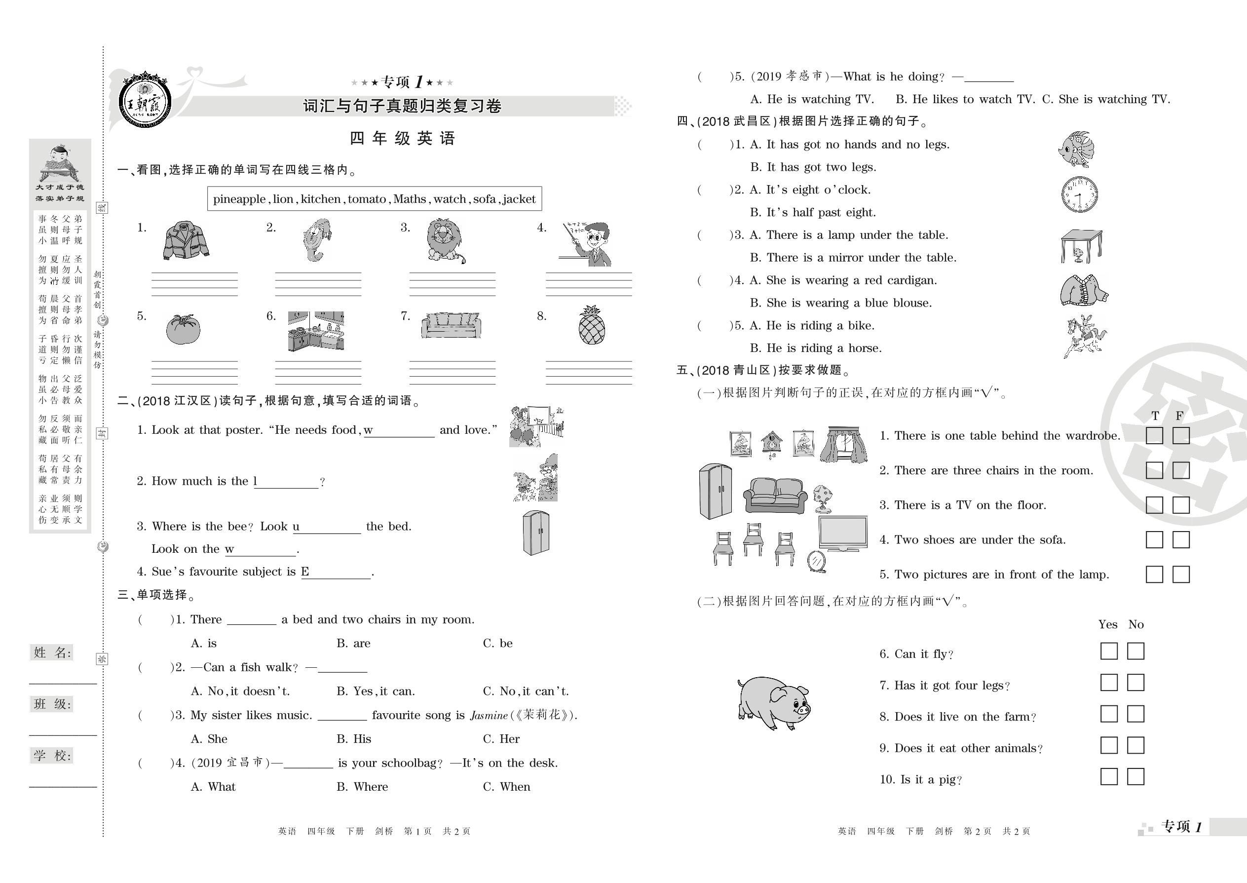 王朝霞期末专项卷——词汇与句子、阅读理解真题归类复习卷四年级下册英语(剑桥版)_R21080791540【0】