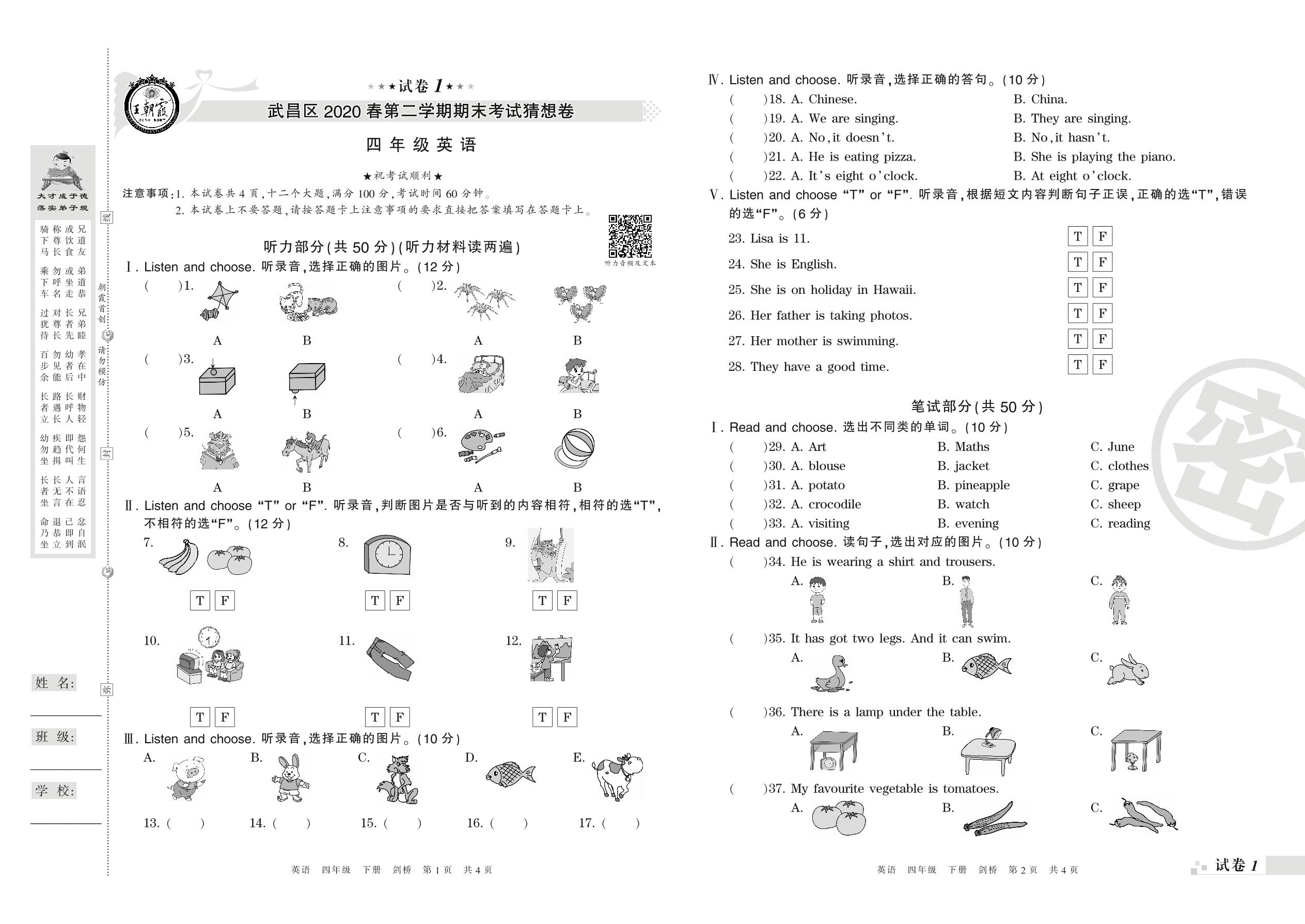 2018-2019学年第二学期武汉市武昌区四年级英语试卷(剑桥版)【1】