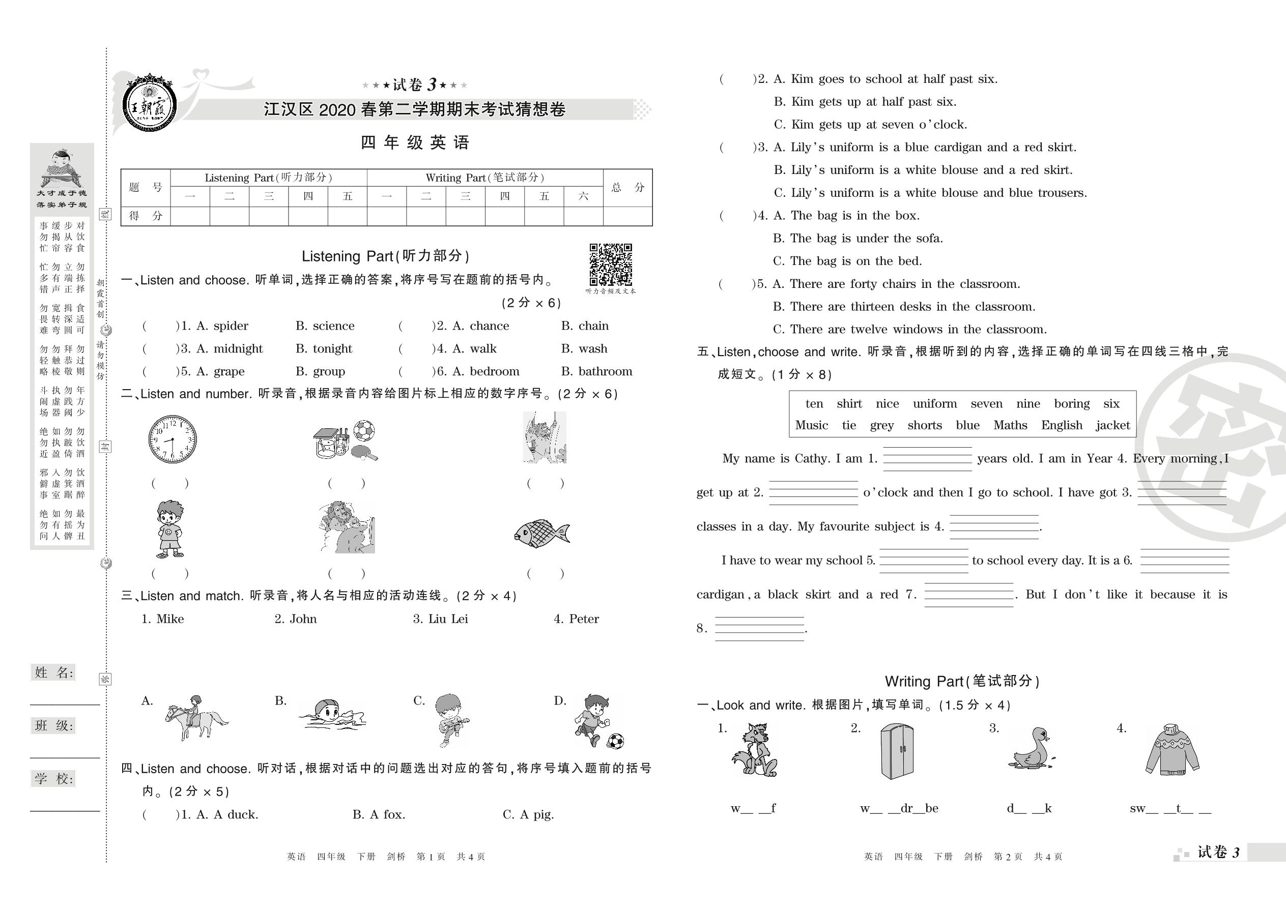 2018-2019学年第二学期武汉市江汉区四年级英语试卷(剑桥版)【3】