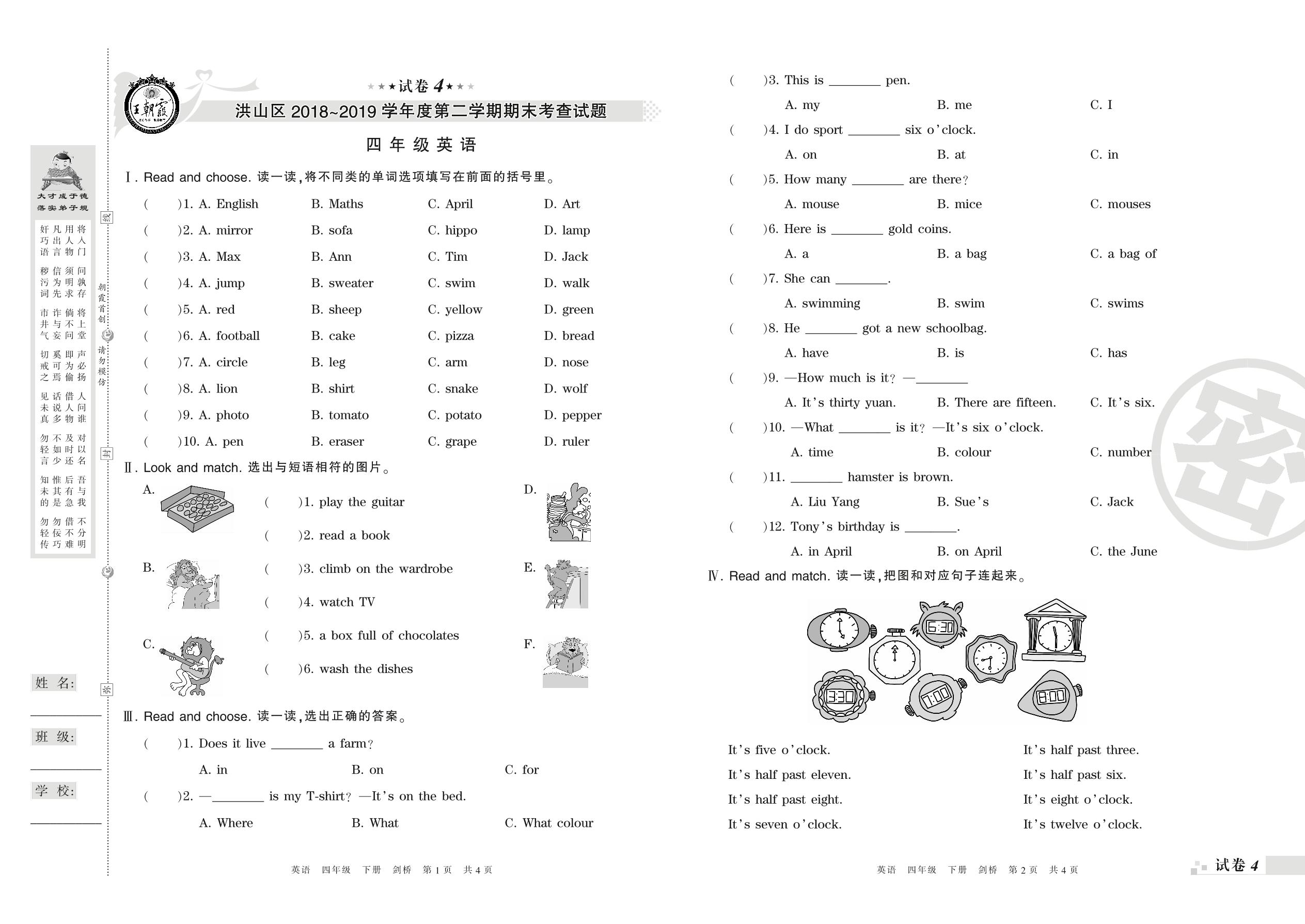 2018-2019学年第二学期武汉市洪山区四年级英语试卷(剑桥版)【4】