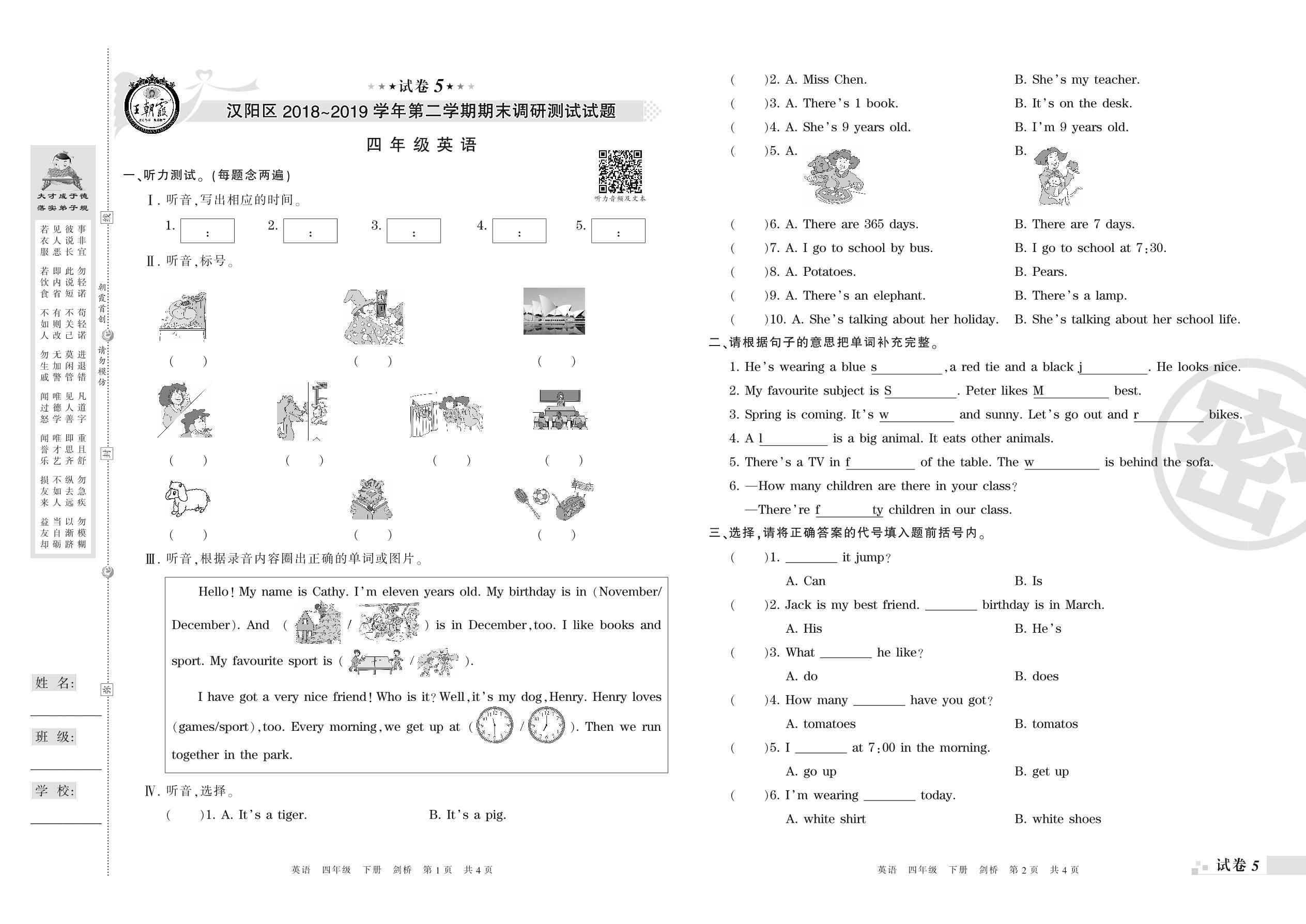 2018-2019学年第二学期武汉市汉阳区四年级英语试卷(剑桥版)【5】