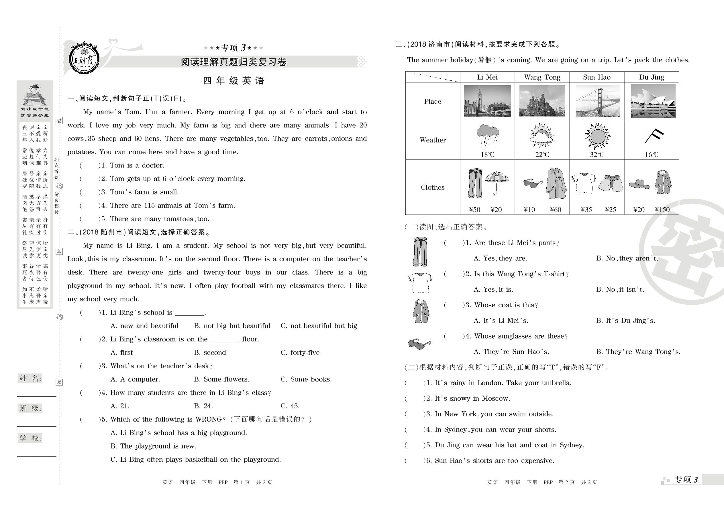 王朝霞期末专项卷——阅读理解真题归类复习卷、新颖题速递:绘本阅读四年级下册英语(PEP版)_R21080791638【0】