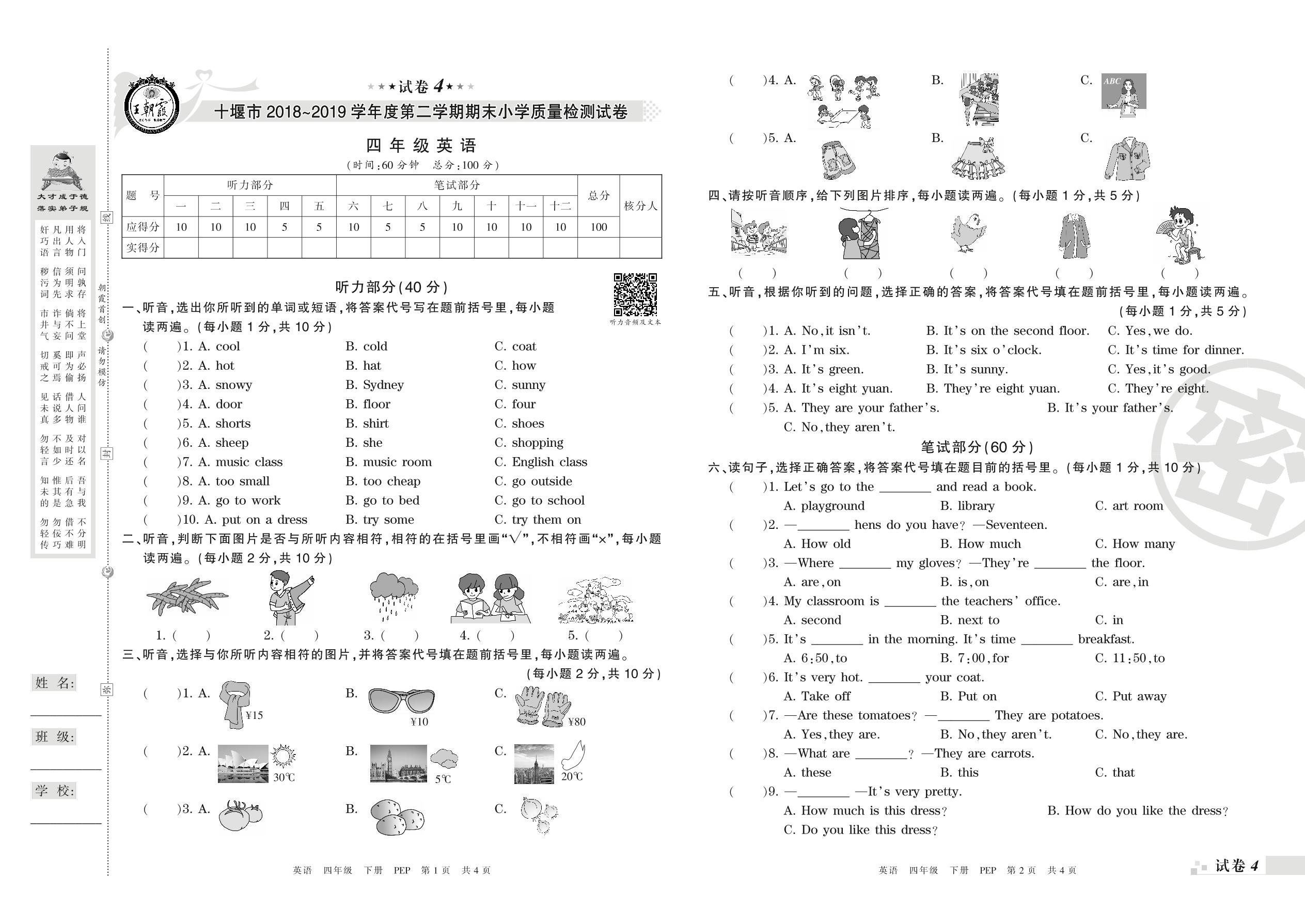 2018-2019学年第二学期十堰市四年级英语试卷(PEP版)【4】