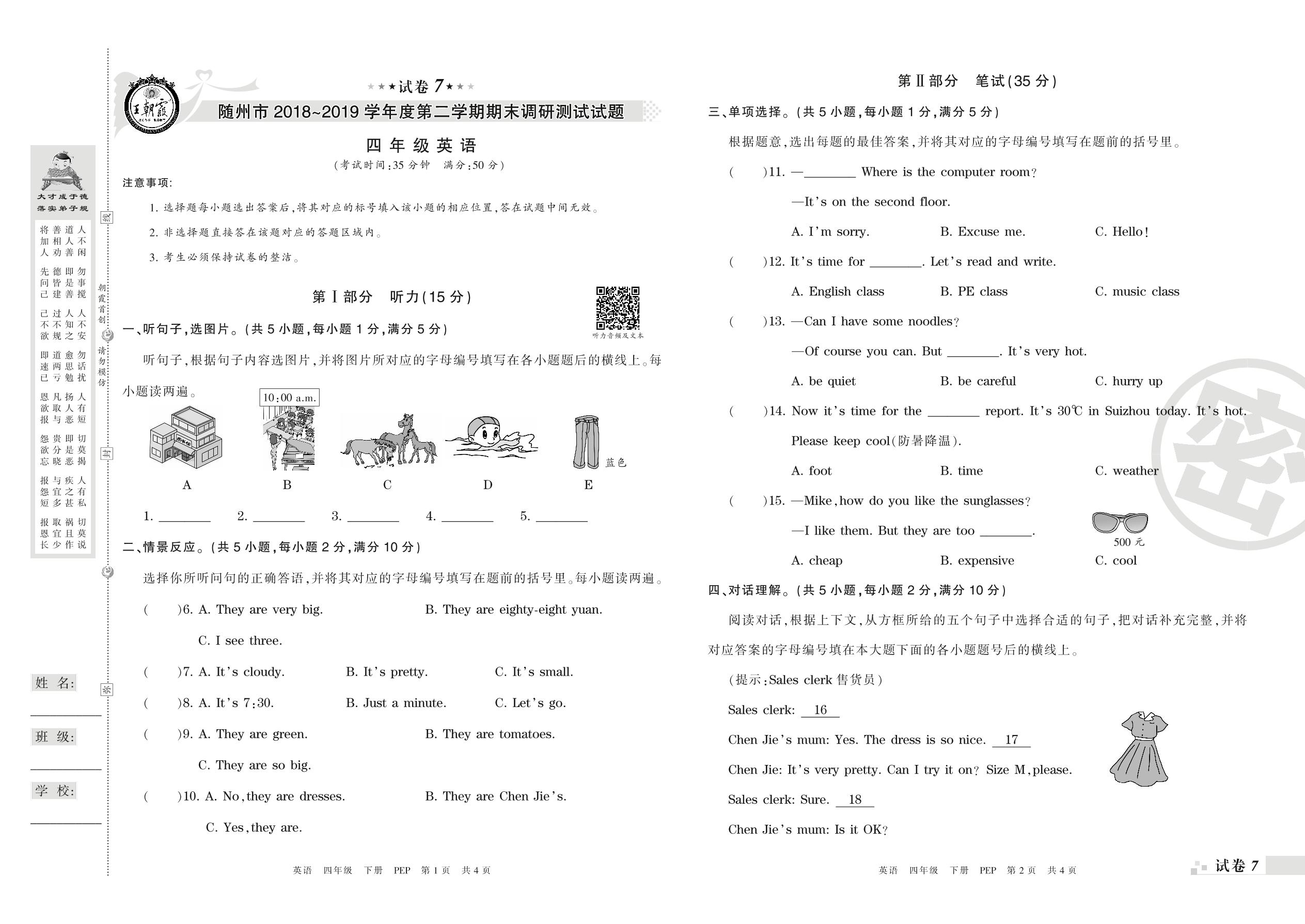 2018-2019学年第二学期随州市四年级英语试卷(PEP版)【7】