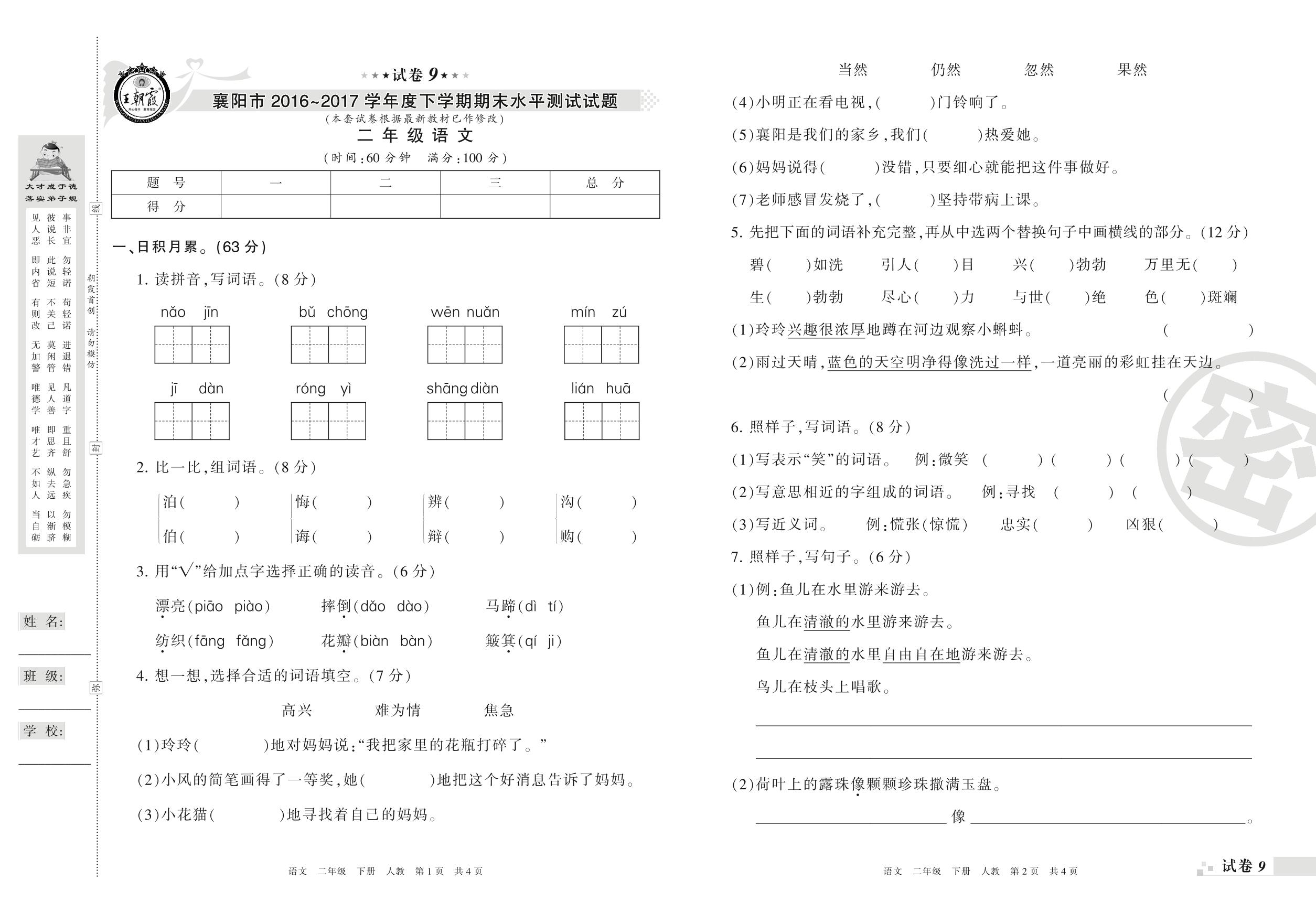 2016-2017学年第二学期襄阳市二年级语文试卷(人教版)【9】