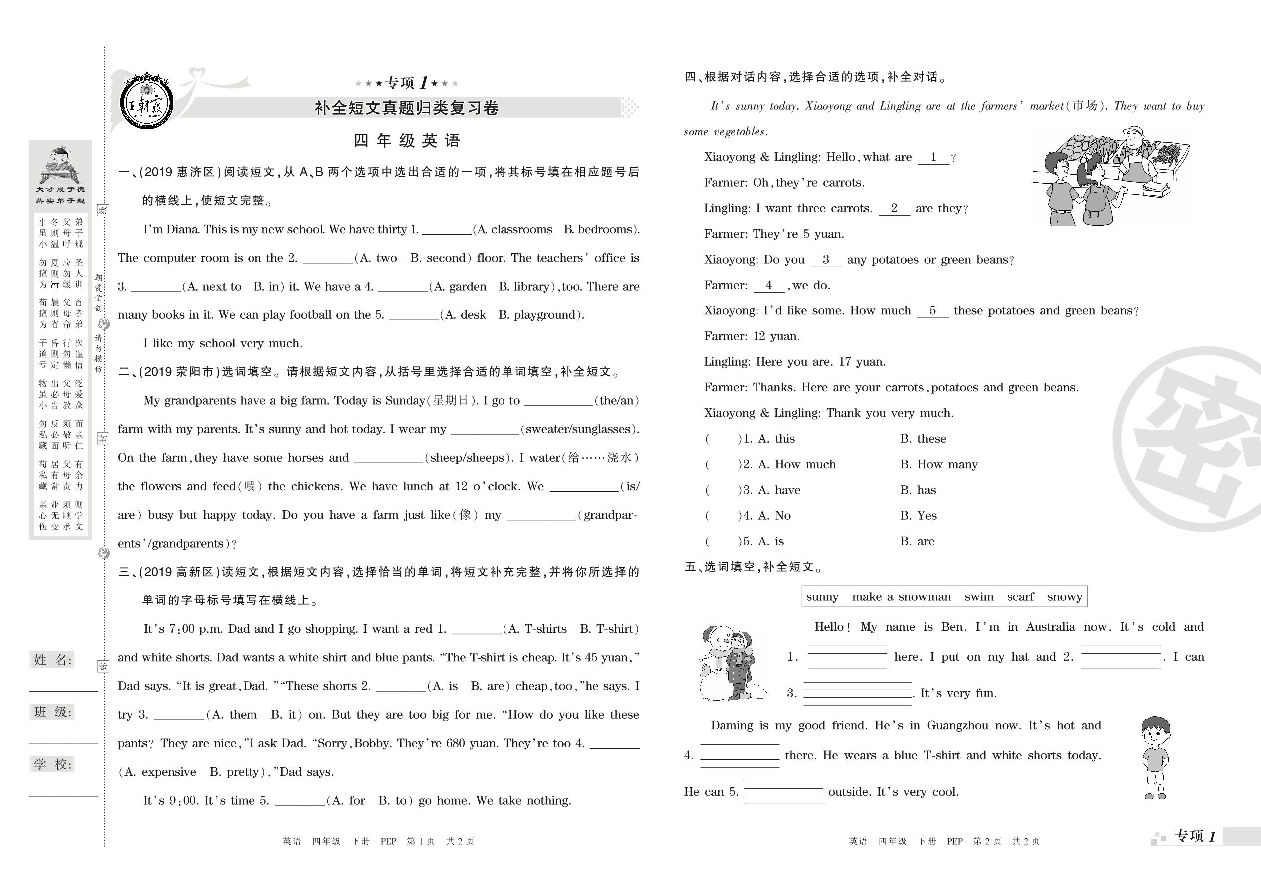 王朝霞期末专项卷——补全短文、阅读理解真题归类复习卷四年级下册英语(PEP版)_R21080791725【0】