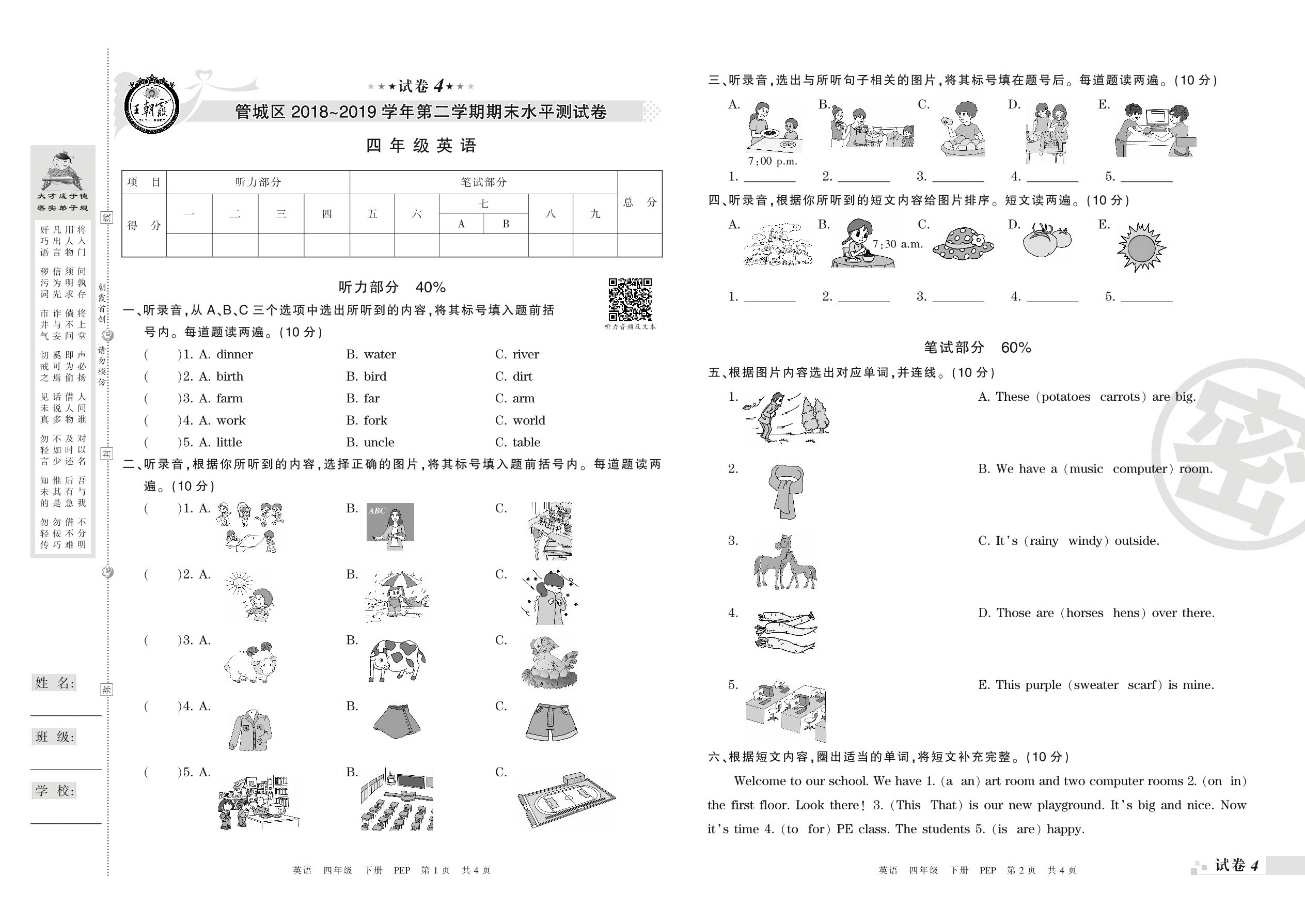 2018-2019学年第二学期郑州市管城区四年级英语试卷(PEP版)【4】