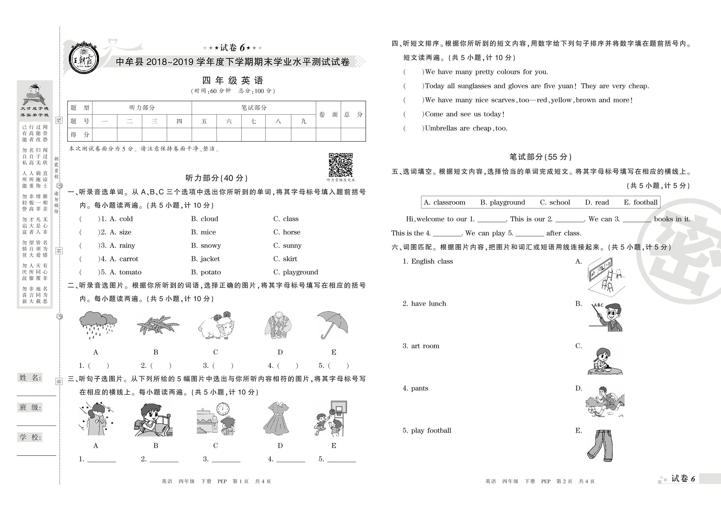 2018-2019学年第二学期郑州市中牟县四年级英语试卷(PEP版)【6】
