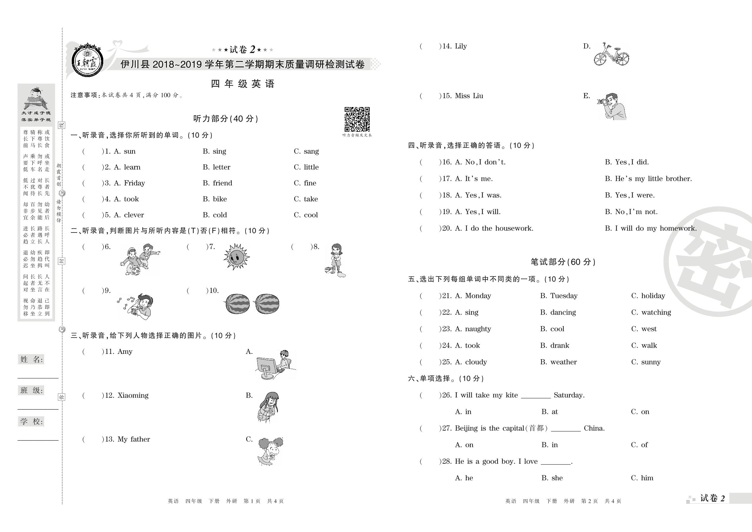 2018-2019学年第二学期洛阳市伊川县四年级英语试卷(外研版)【2】