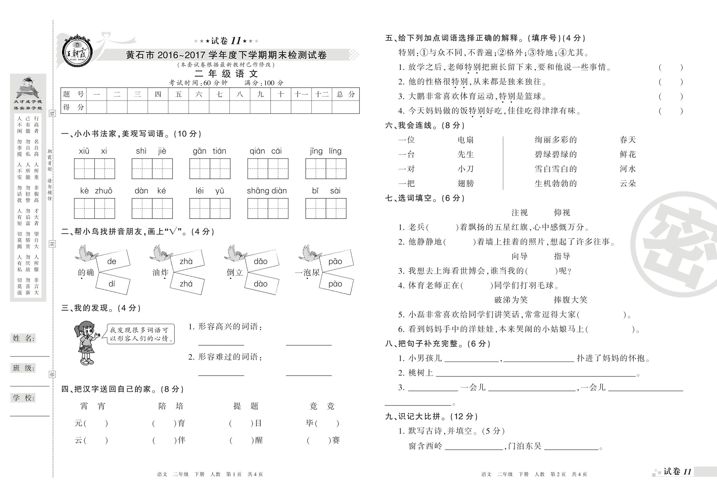2016-2017学年第二学期黄石市二年级语文试卷(人教版)【11】