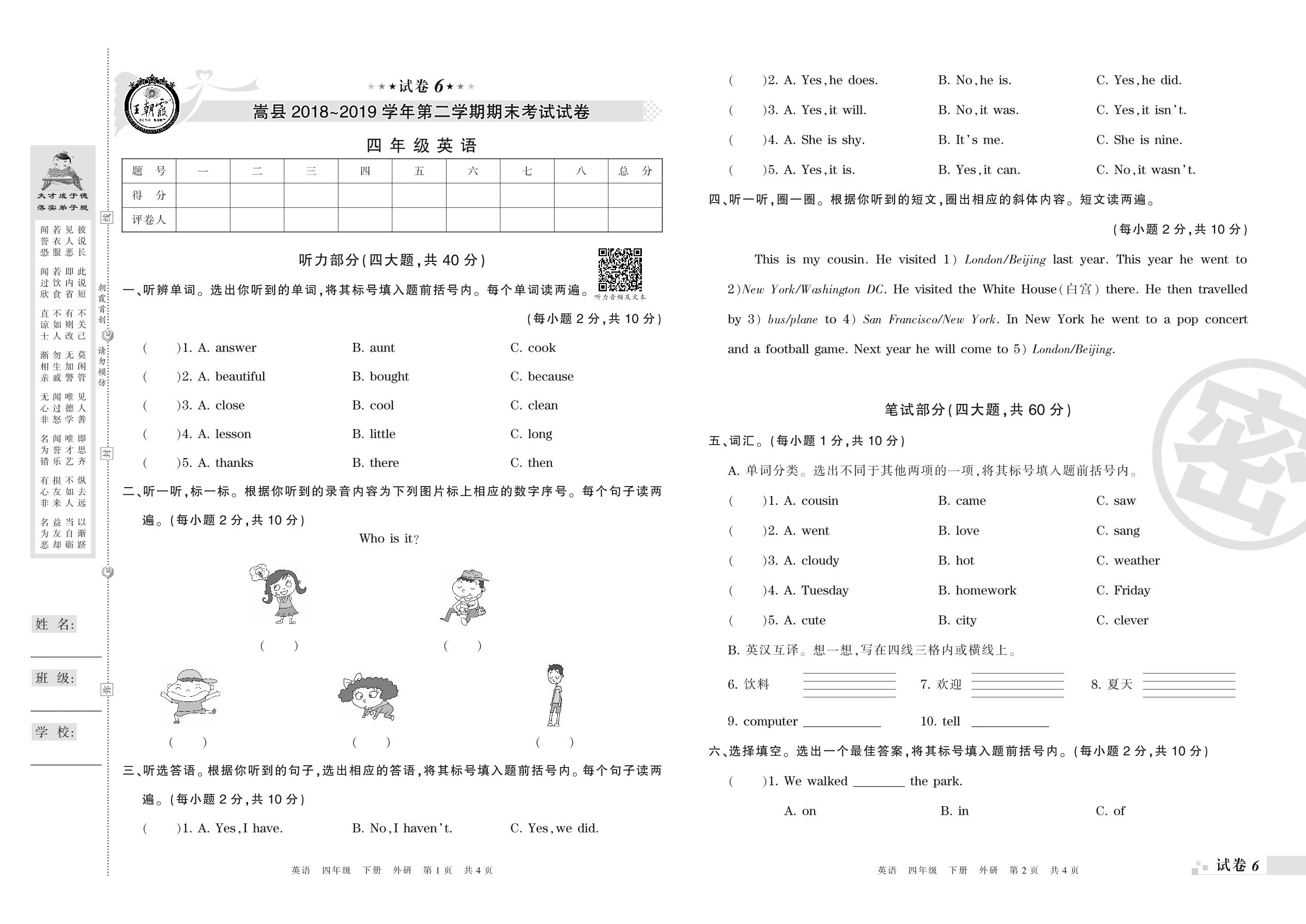 2018-2019学年第二学期洛阳市嵩县四年级英语试卷(外研版)【6】