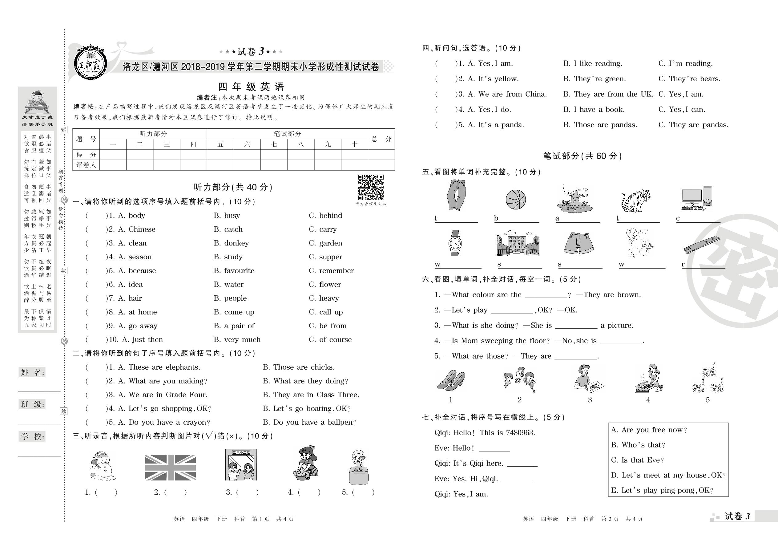 2018-2019学年第二学期洛阳市洛龙区、瀍河区四年级英语试卷(科普版)【3】