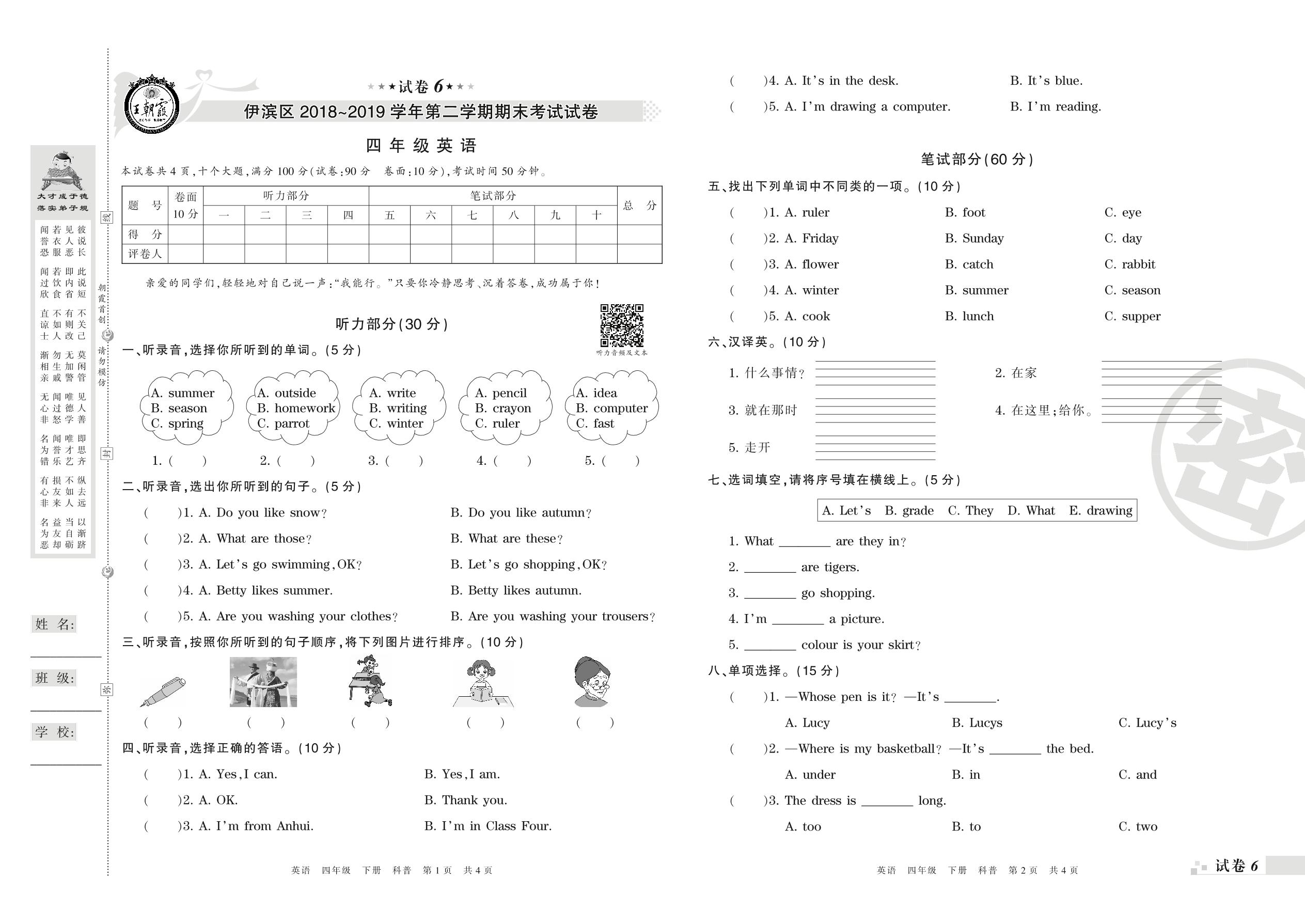 2018-2019学年第二学期洛阳市伊滨区四年级英语试卷(科普版)【6】