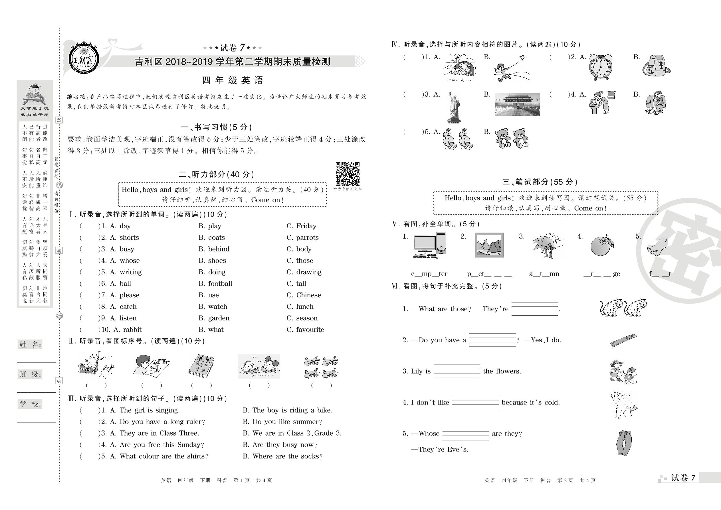 2018-2019学年第二学期洛阳市吉利区四年级英语试卷(科普版)【7】
