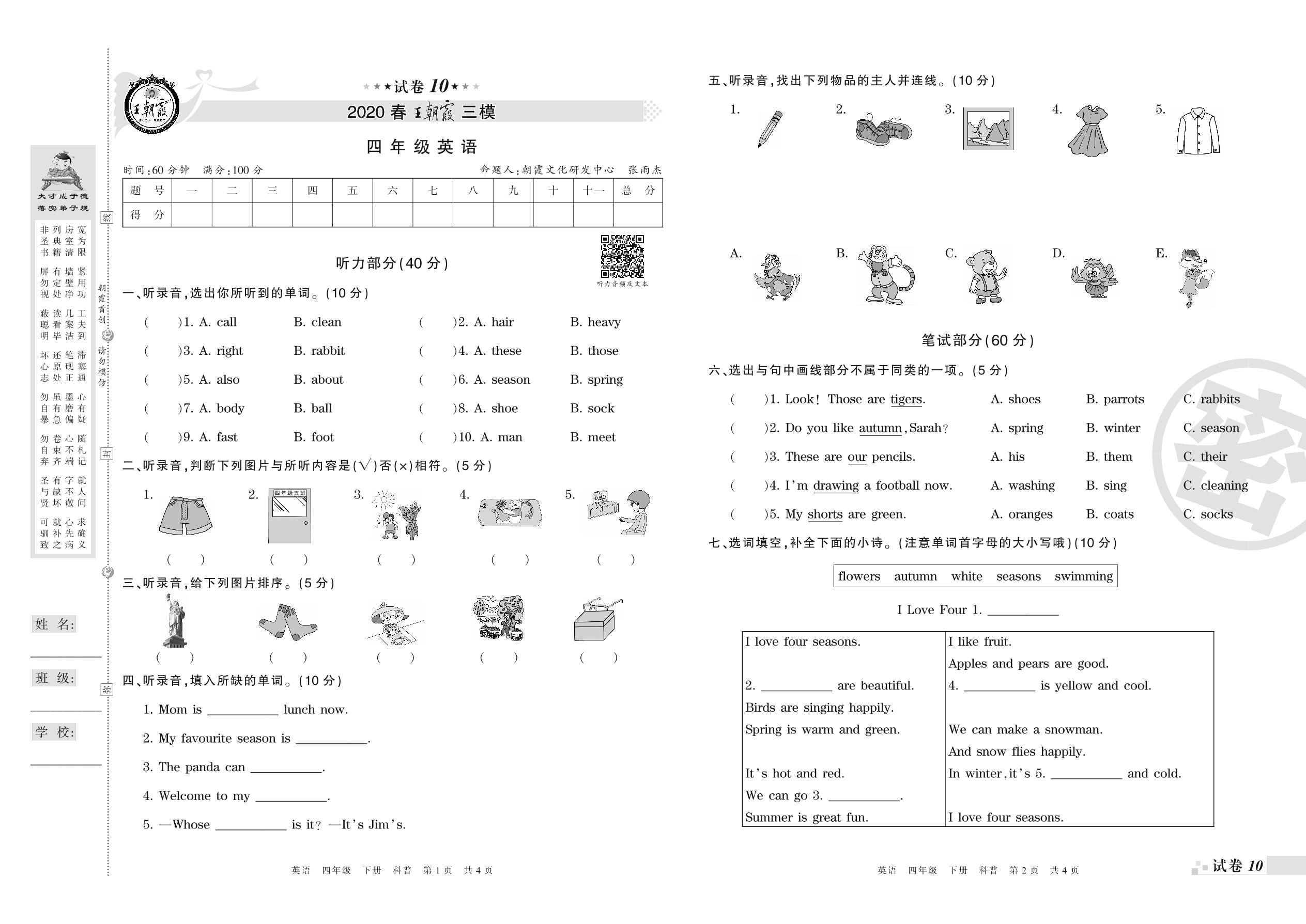 王朝霞期末模拟卷四年级下册英语(科普版)_R21080792143【10】