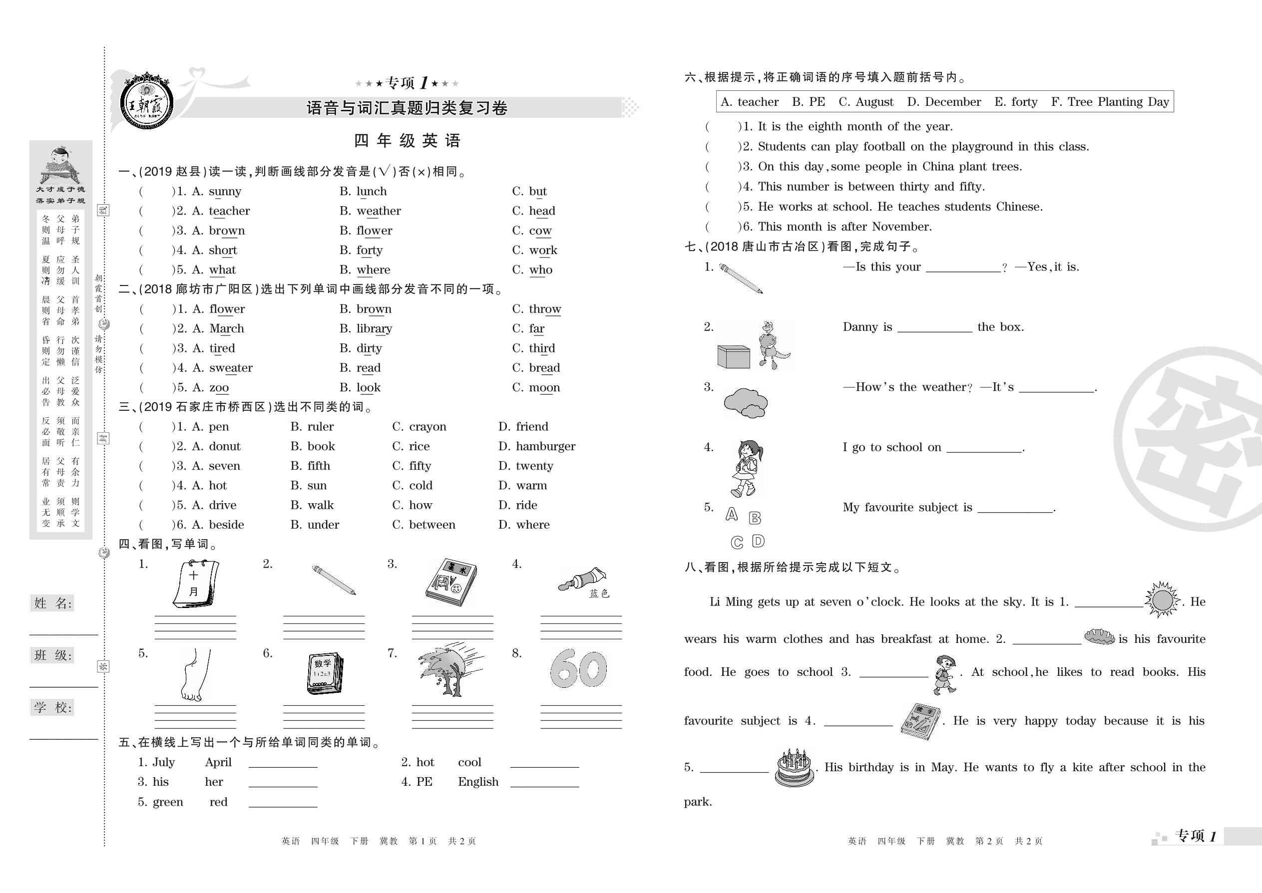 王朝霞期末专项卷——语音与词汇、句子(一)真题归类复习卷四年级下册英语(冀教版)_R21080792200【0】