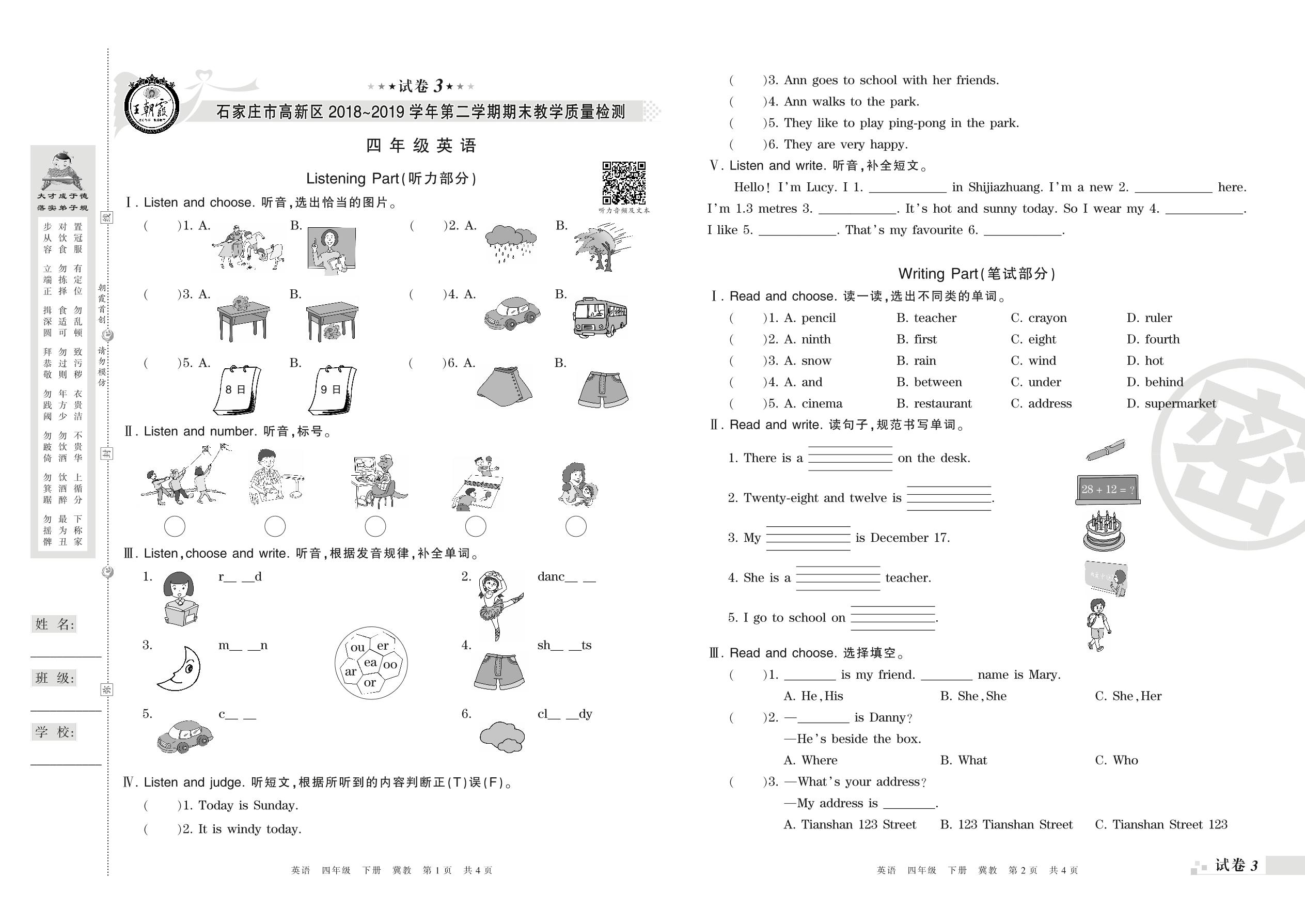 2018-2019学年第二学期石家庄市高新区四年级英语试卷(冀教版)【3】