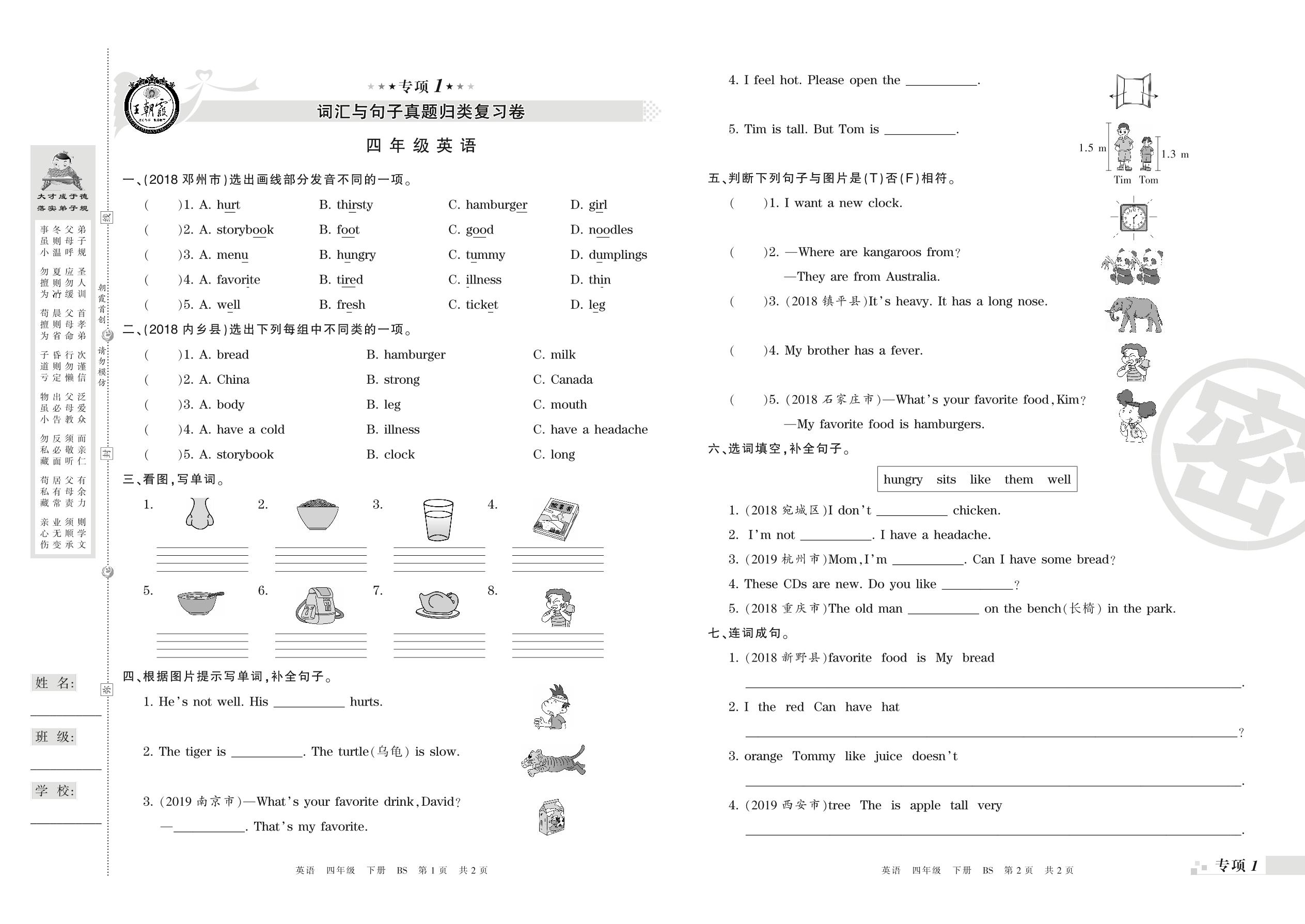 王朝霞期末专项卷——词汇与句子、情景交际真题归类复习卷四年级下册英语(北师版)_R21080792327【0】