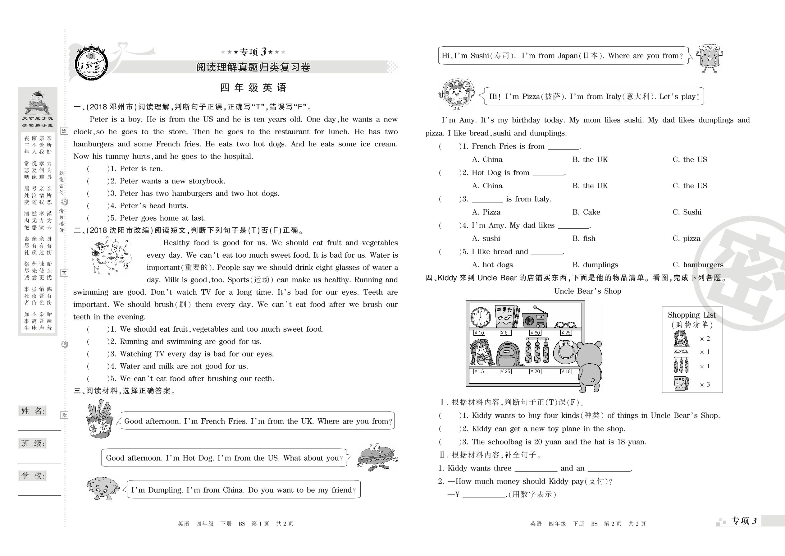 王朝霞期末专项卷——阅读理解真题归类复习卷、新颖题速递:绘本阅读四年级下册英语(北师版)_R21080792332【0】