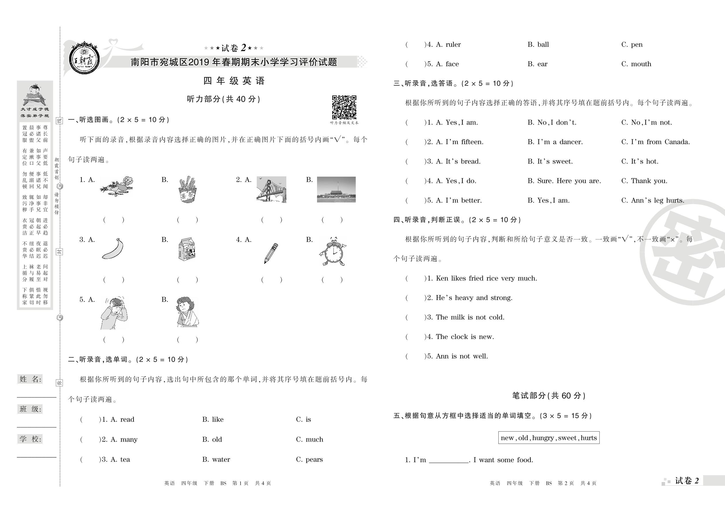 2018-2019学年第二学期南阳市宛城区四年级英语试卷(北师版)【2】