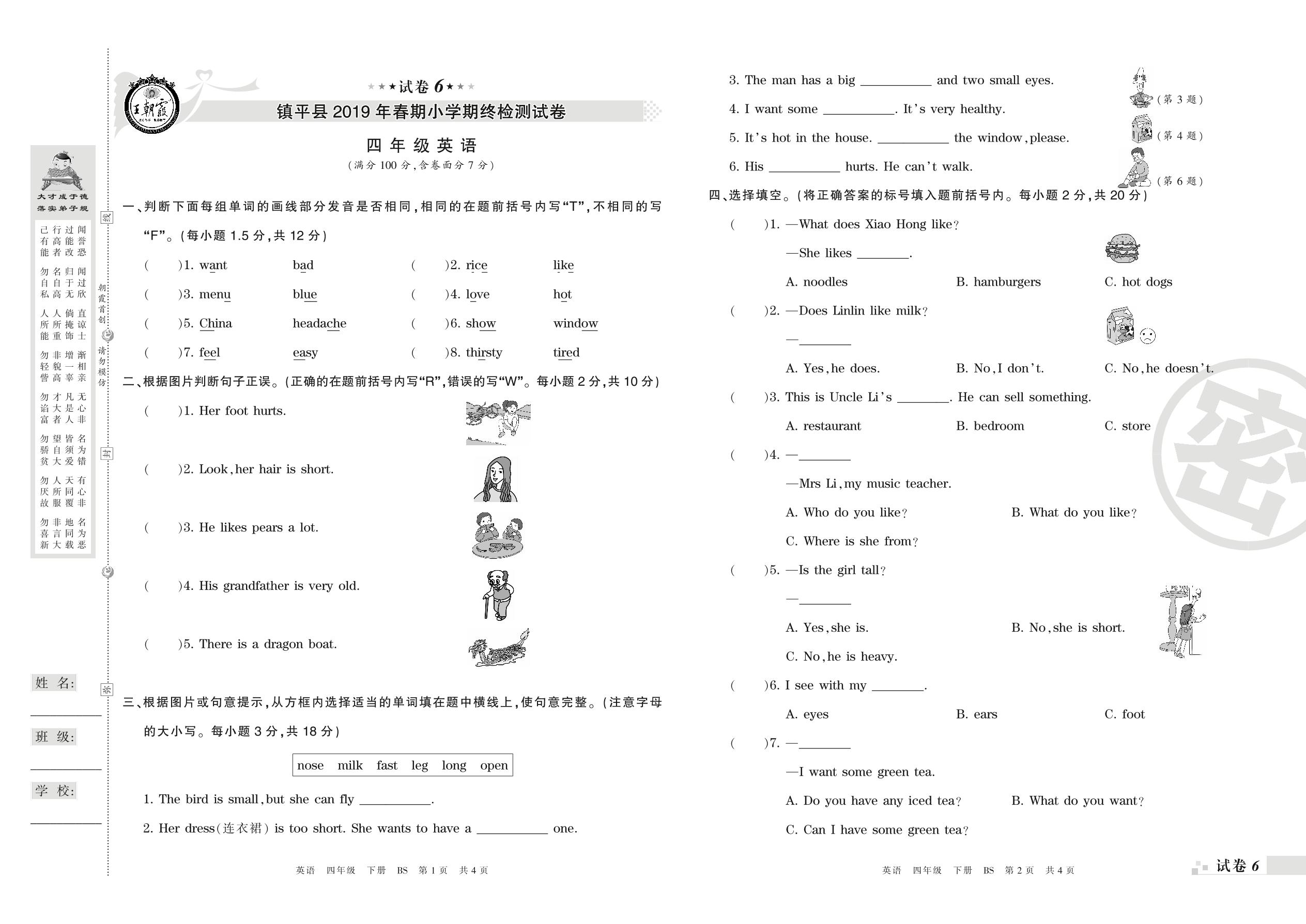 2018-2019学年第二学期南阳市镇平县四年级英语试卷(北师版)【6】