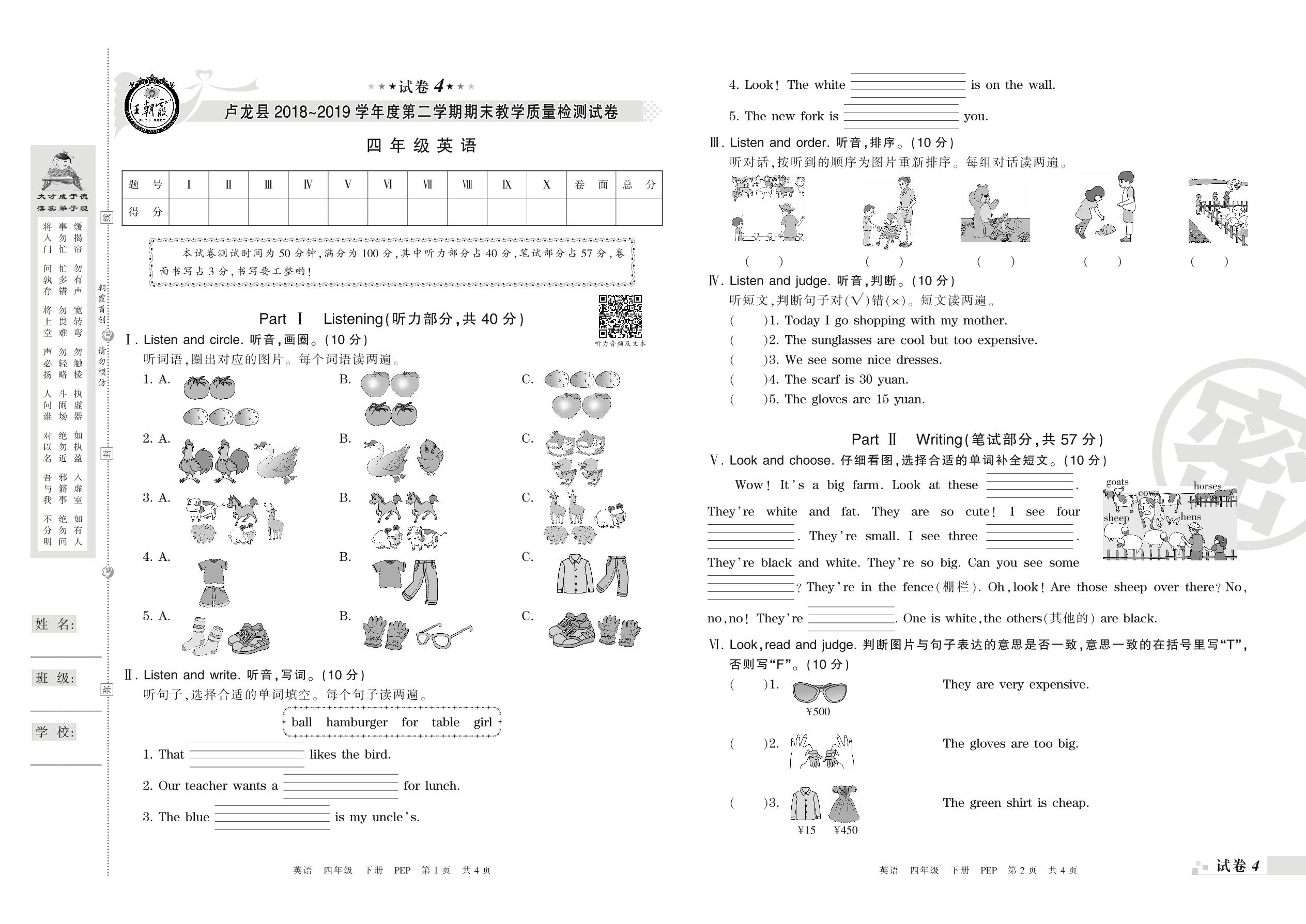 2018-2019学年第二学期秦皇岛市卢龙县四年级英语试卷(PEP版)【4】