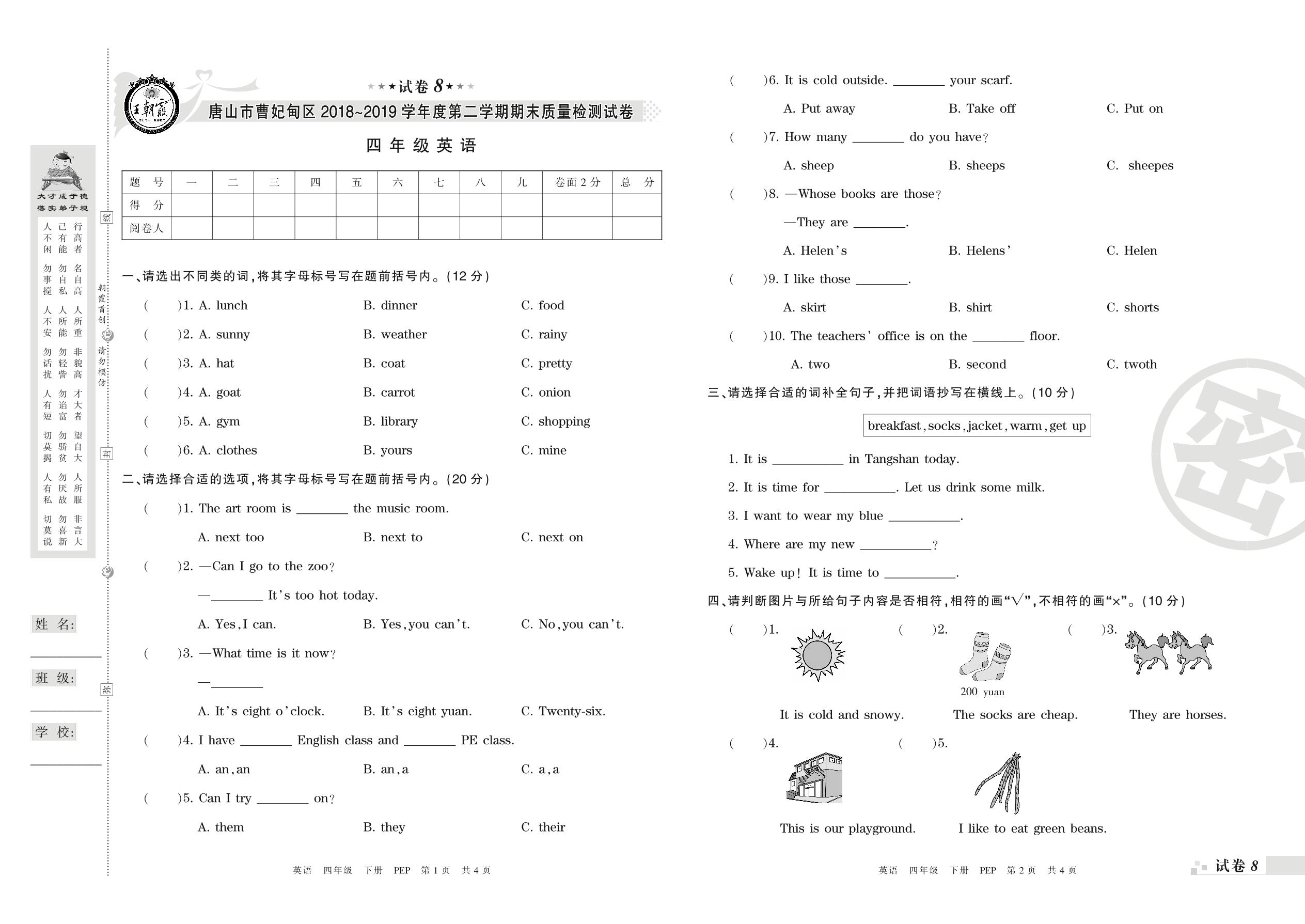 2018-2019学年第二学期唐山市曹妃甸区四年级英语试卷(PEP版)【8】