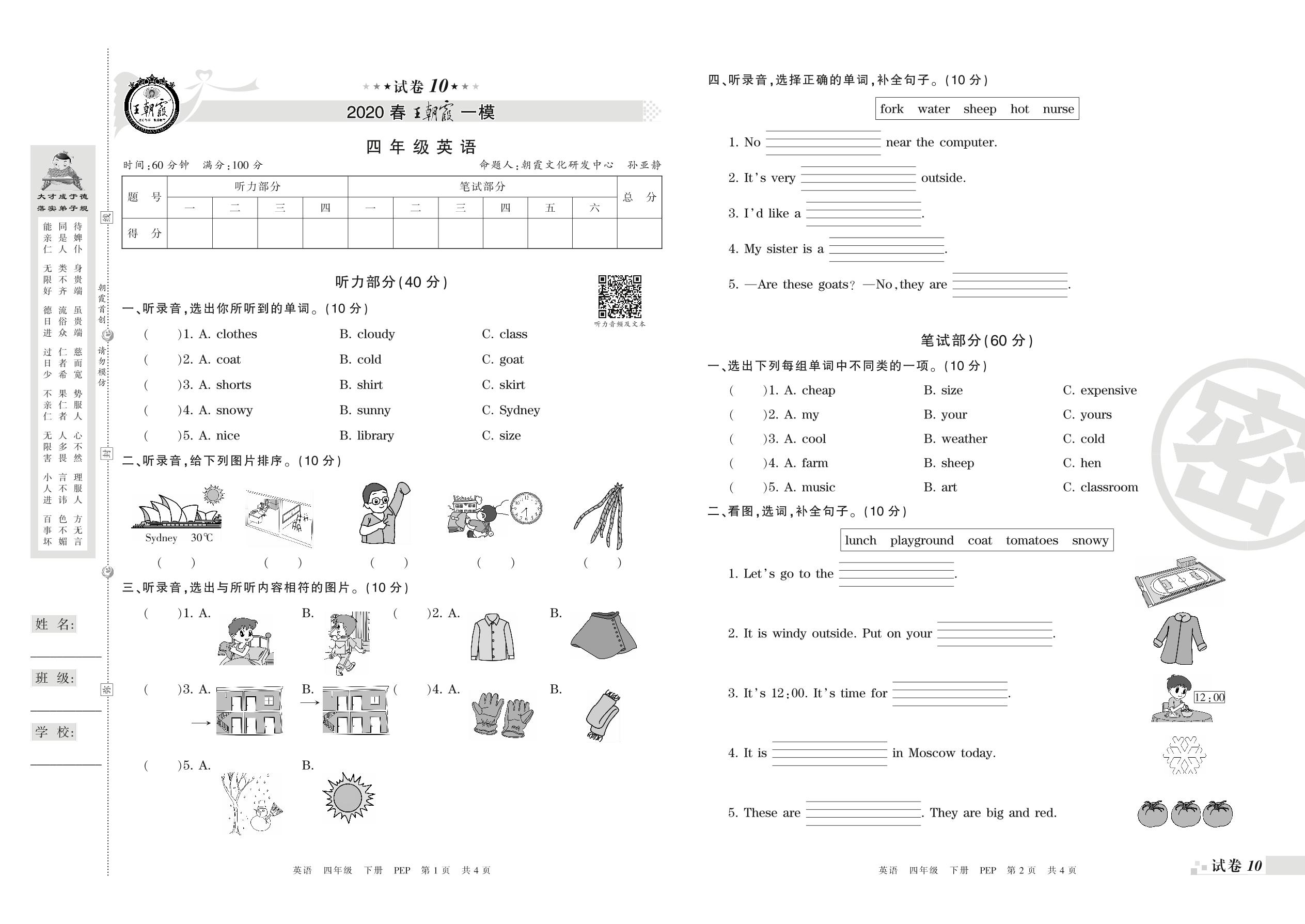王朝霞期末模拟卷四年级下册英语(PEP版)_R21080792541【10】