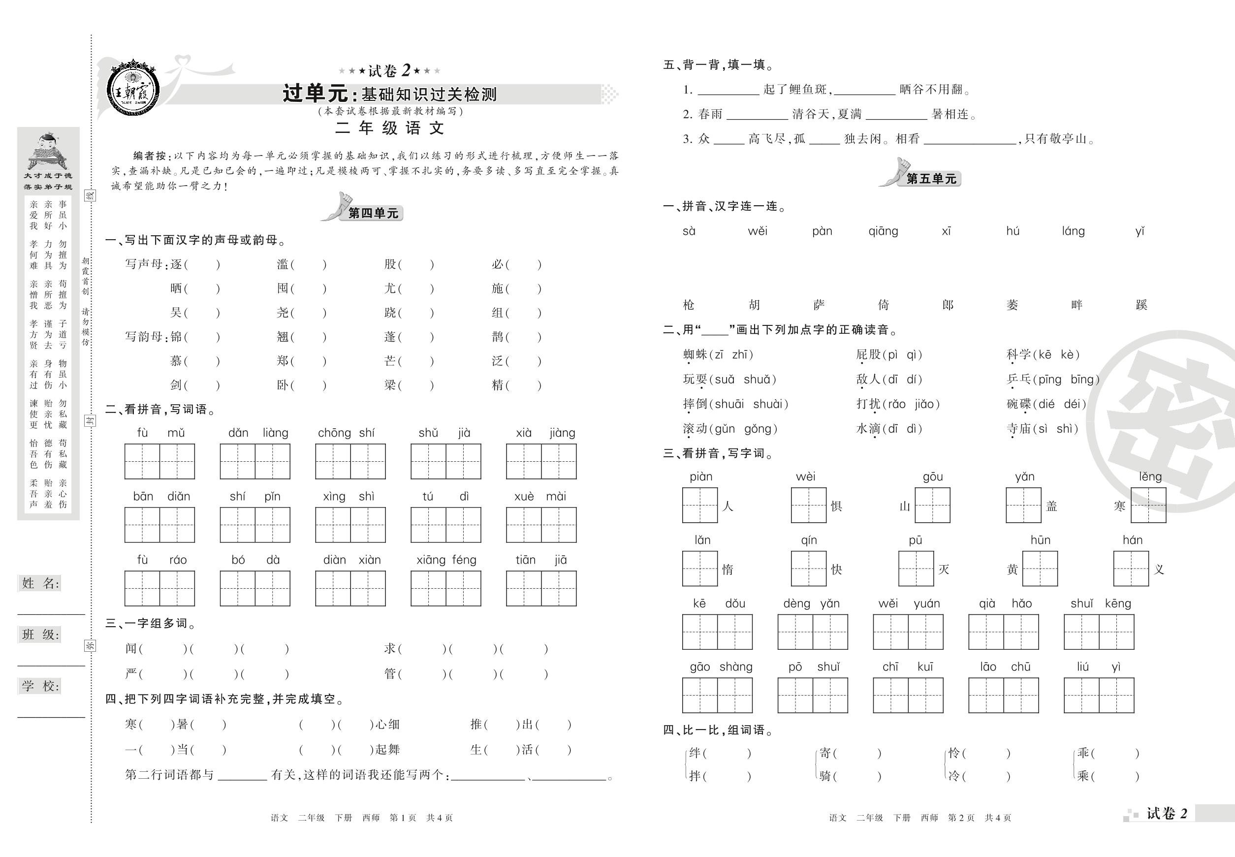 王朝霞期末过单元——基础知识过关检测二年级下册语文(西师版)【2】