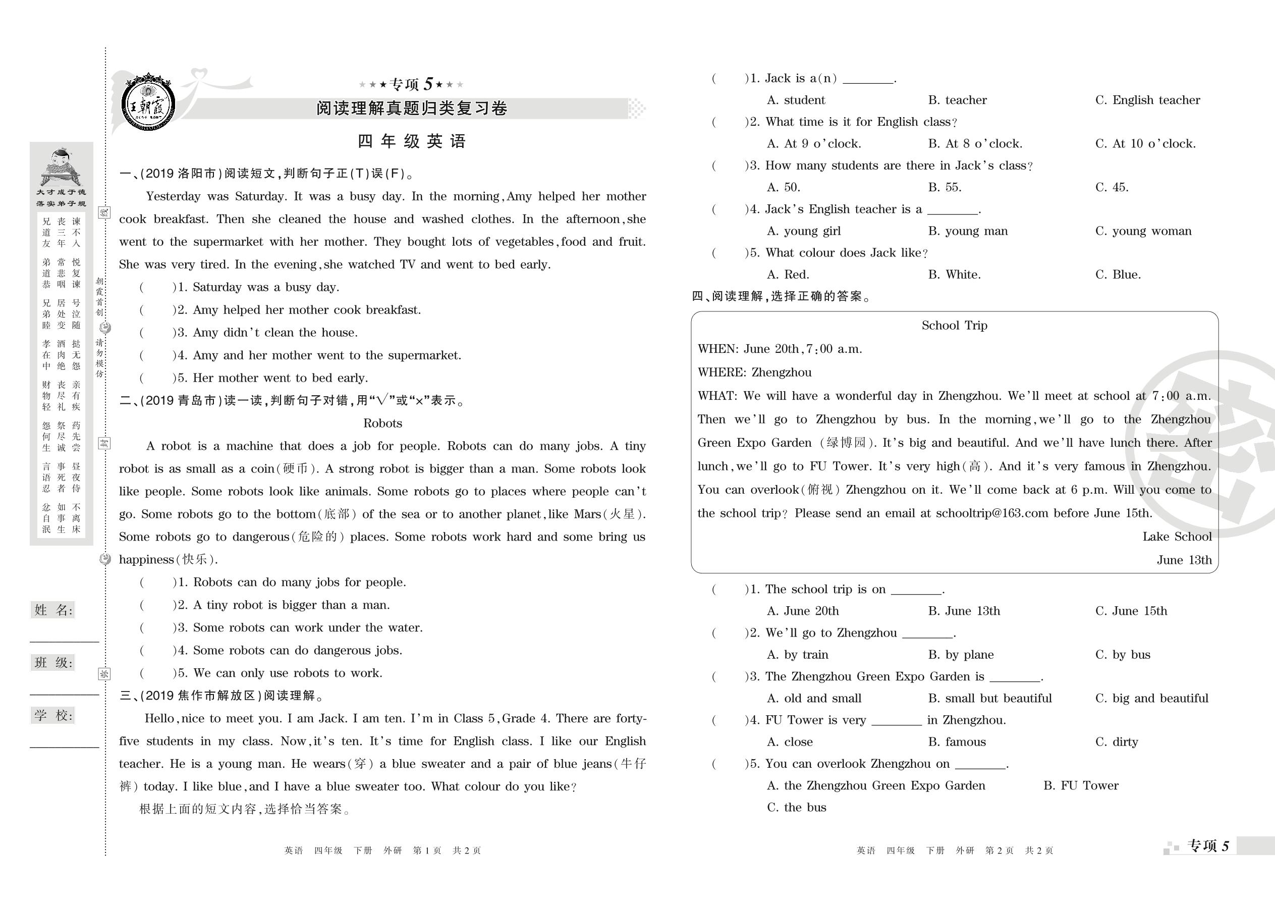 王朝霞期末专项卷——阅读理解真题归类复习卷、新颖题速递:绘本阅读四年级下册英语(外研版)_R21080792558【0】