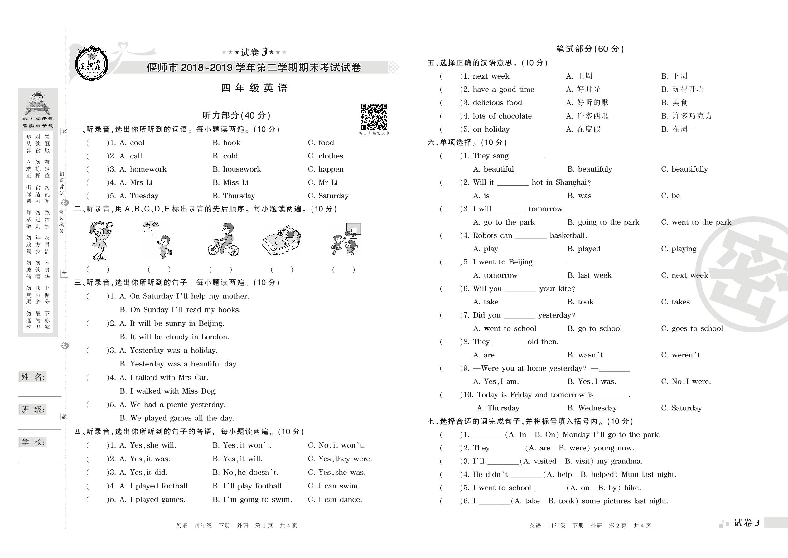 2018-2019学年第二学期偃师市四年级英语试卷(外研版)【3】