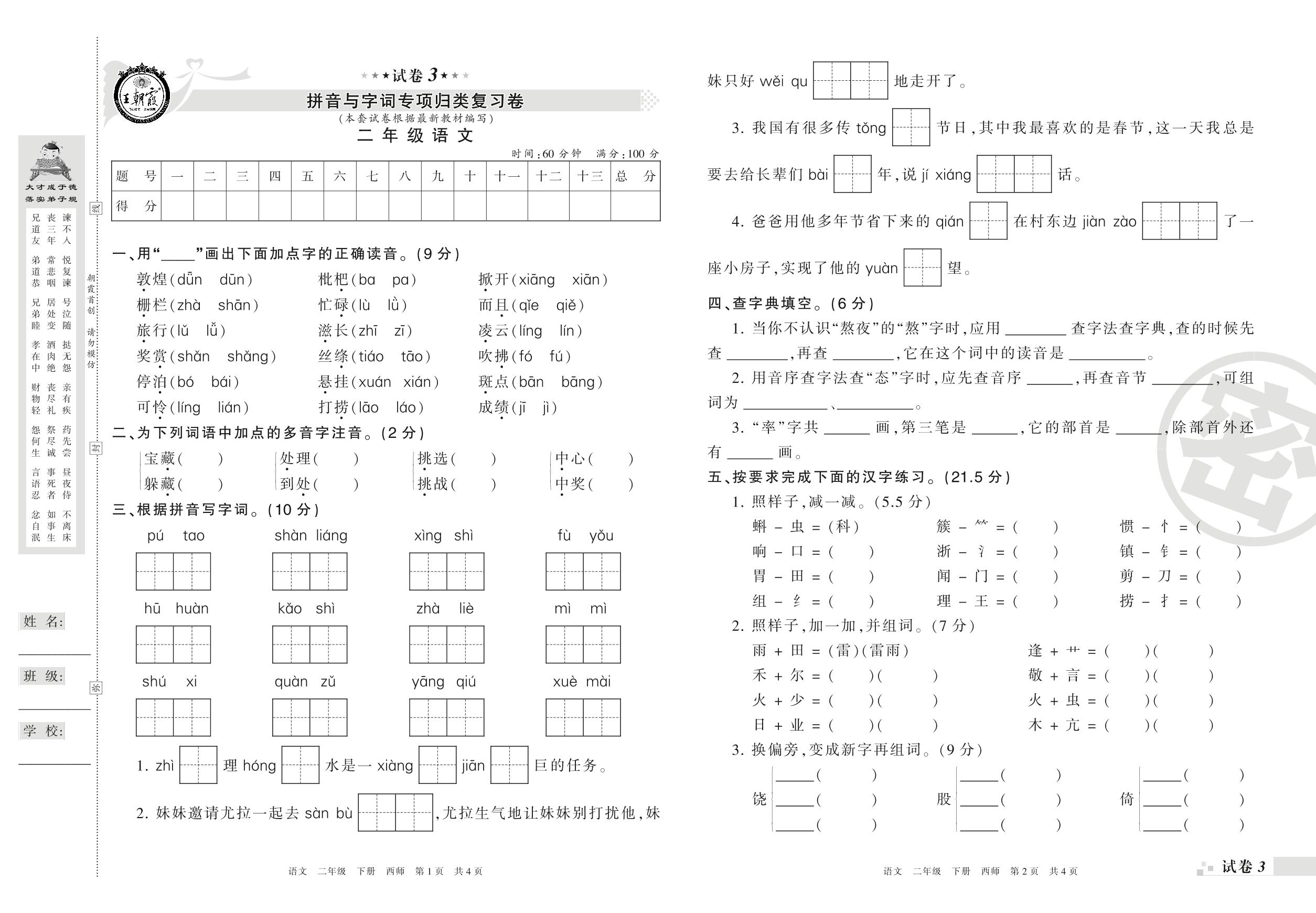 王朝霞期末专项卷——拼音与字词专项归类复习卷二年级下册语文(西师版)_R21080181228【3】