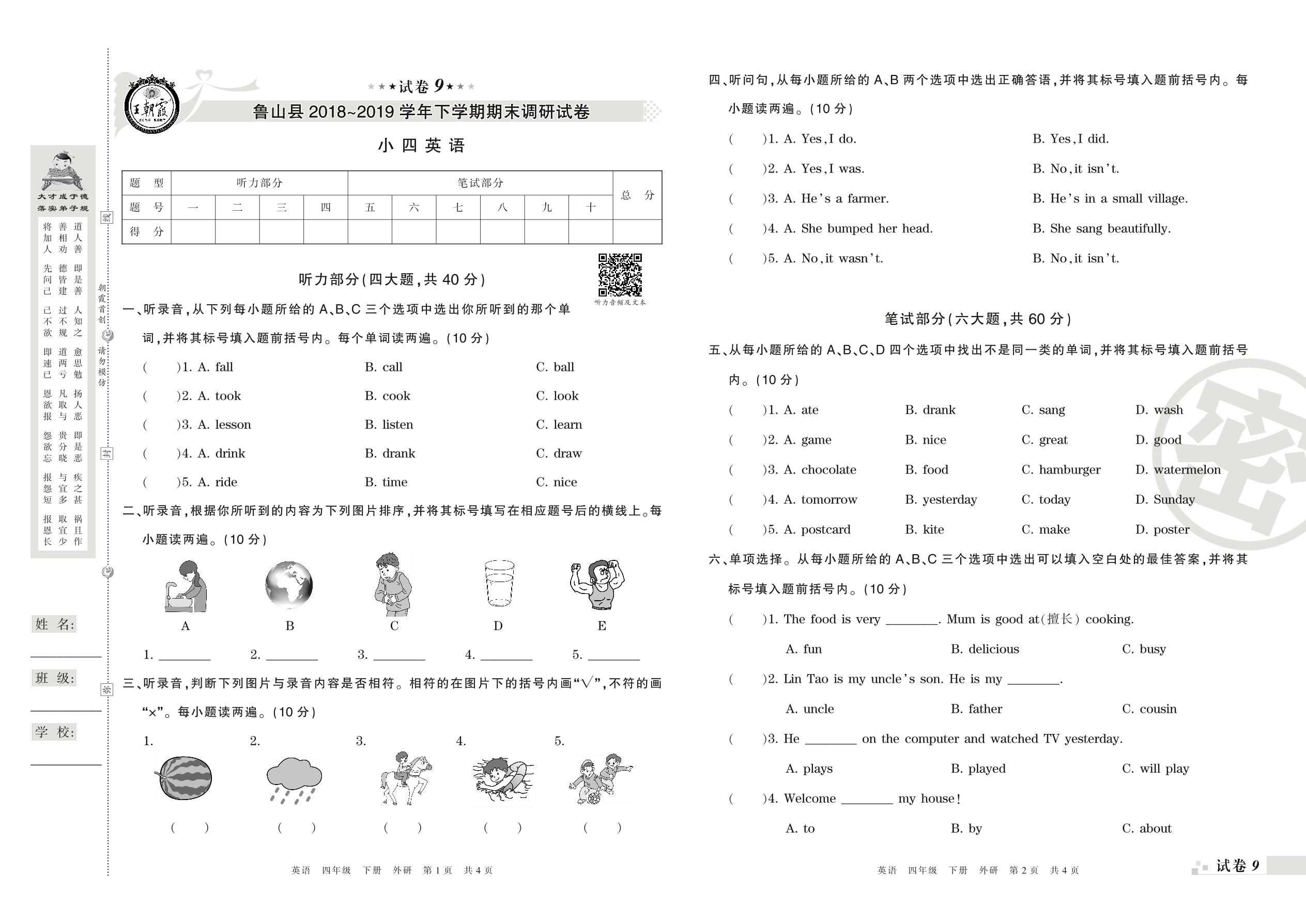 2018-2019学年第二学期平顶山市鲁山县四年级英语试卷(外研版)【9】