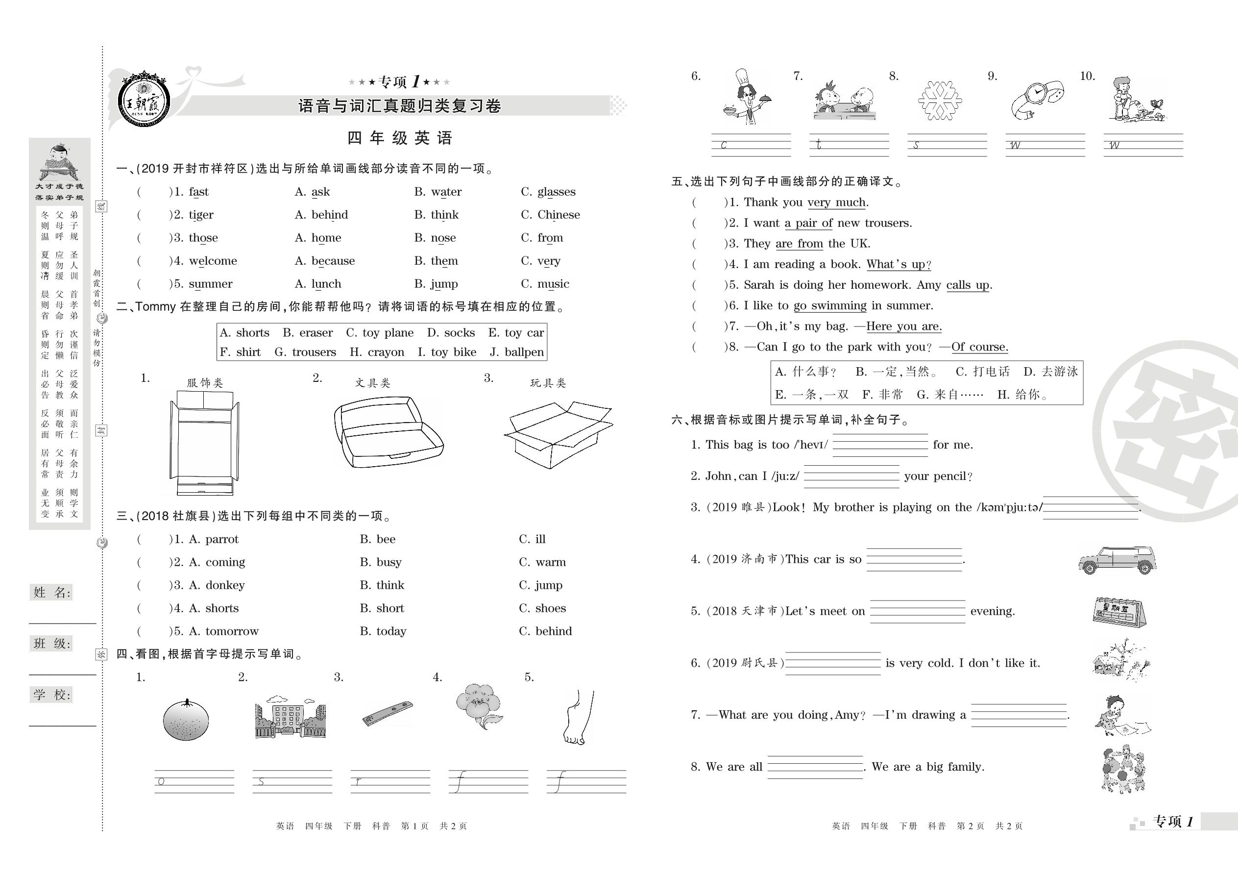 王朝霞期末专项卷——语音与词汇、句子(一)真题归类复习卷四年级下册英语(科普版)_R21080792704【0】